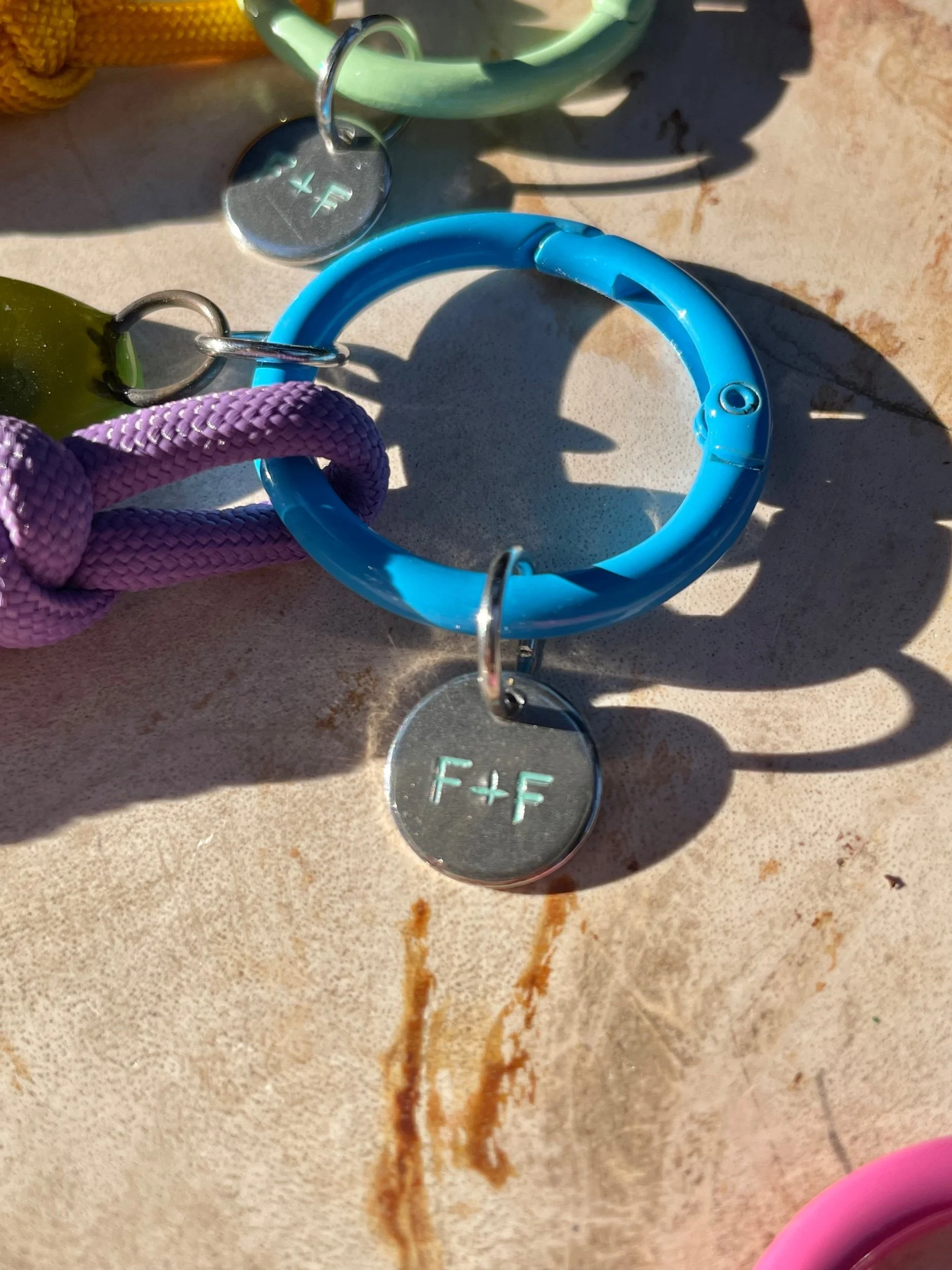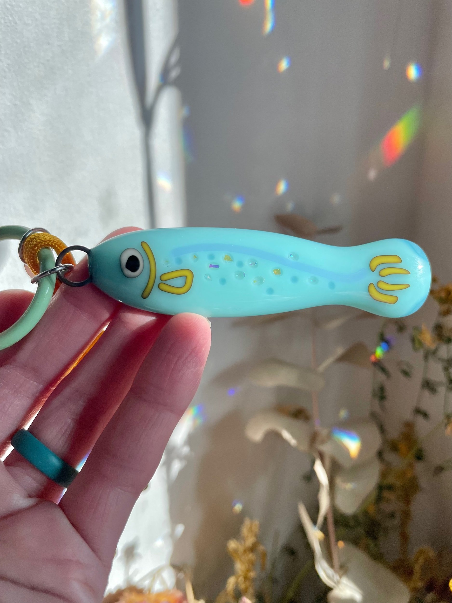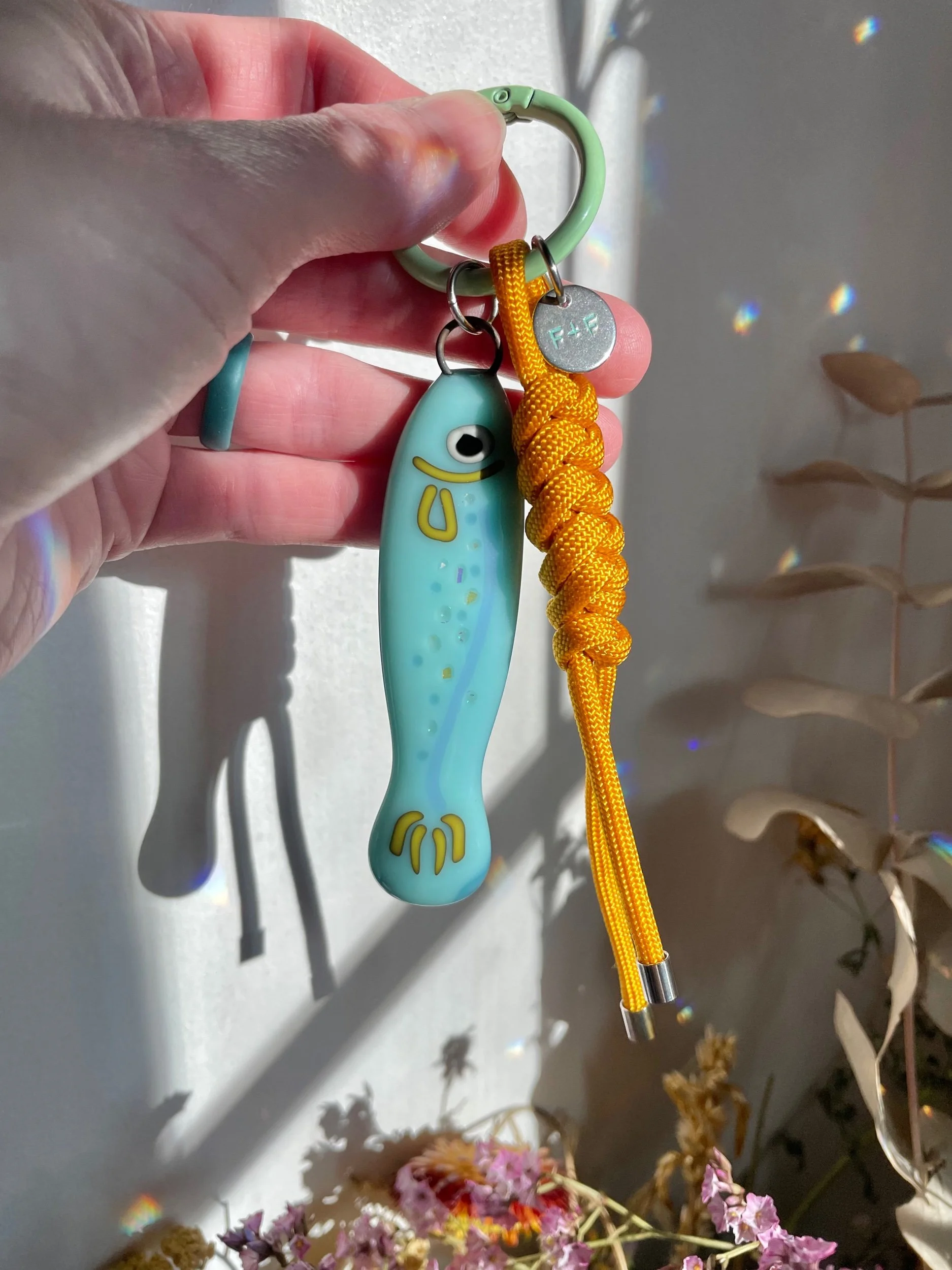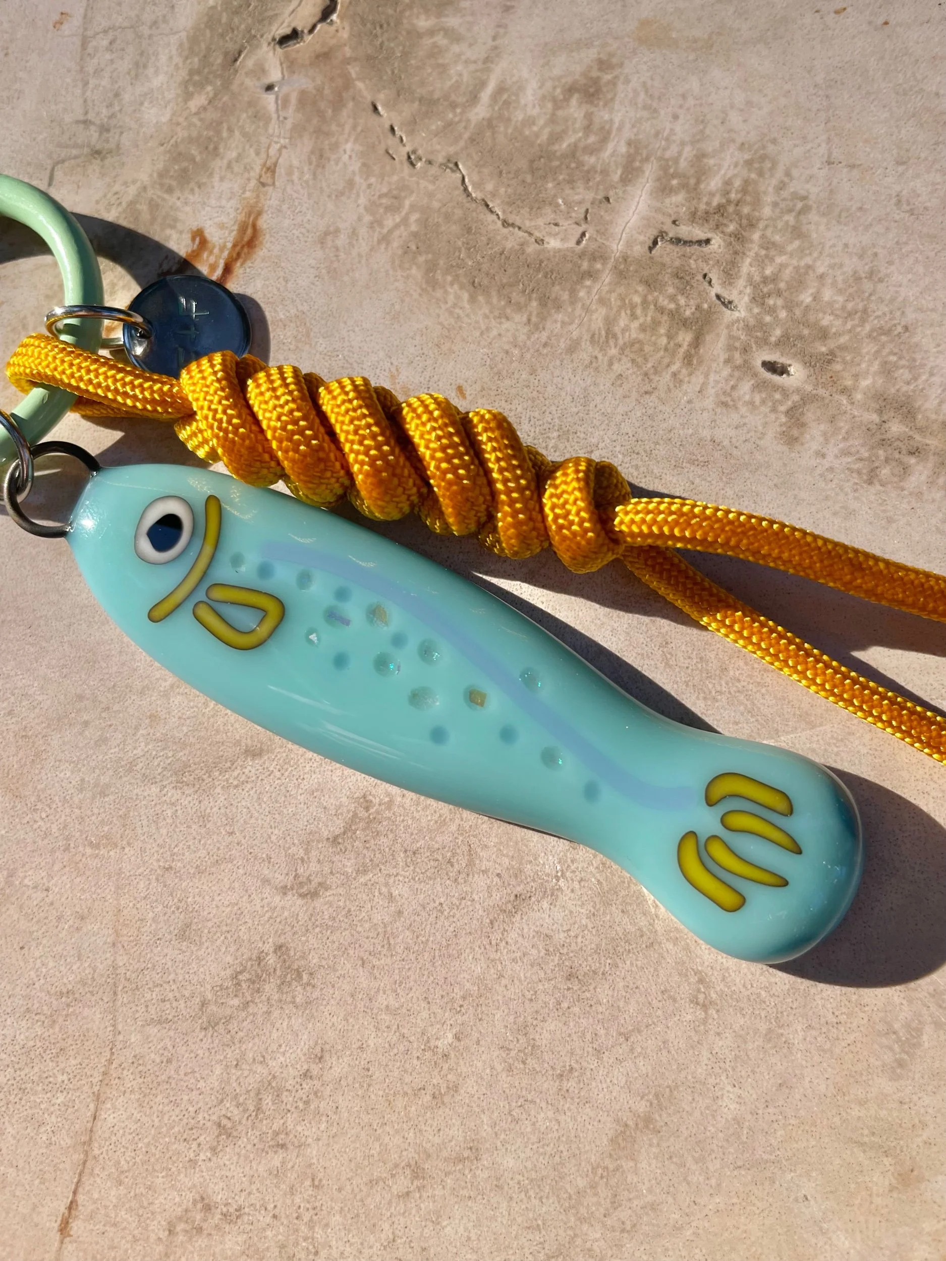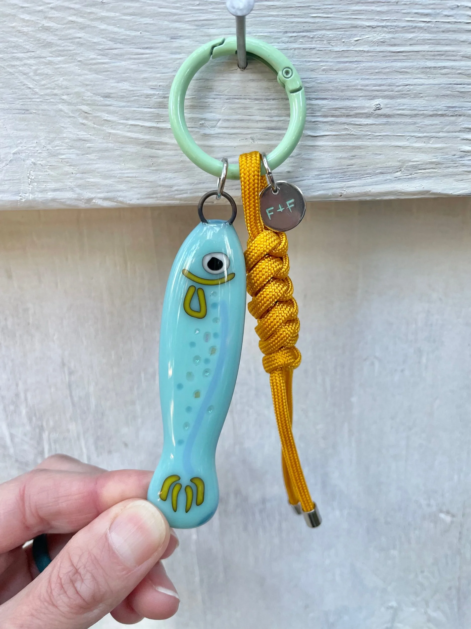 Made of fused glass in lovely blue color with lots of added details including shimmering dichroic glass. Included on the colorful carabiner is a hand knotted paracord dangle and a hand stamped makers mark charm.
