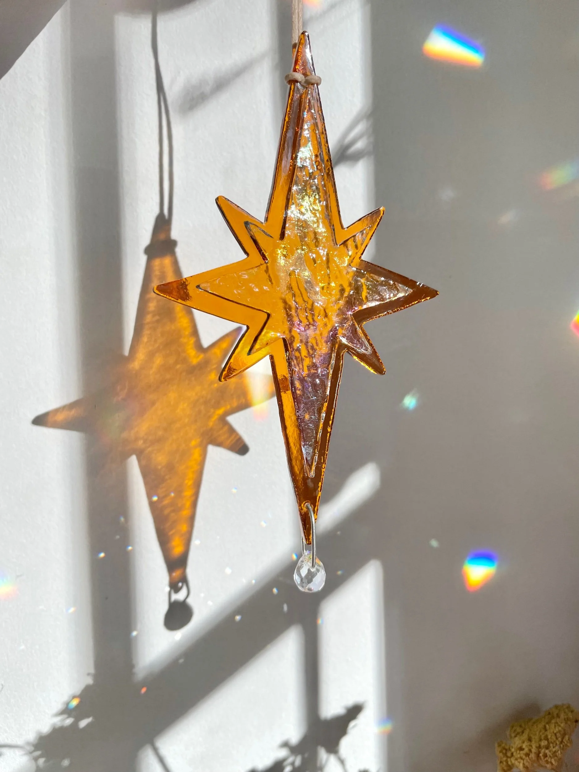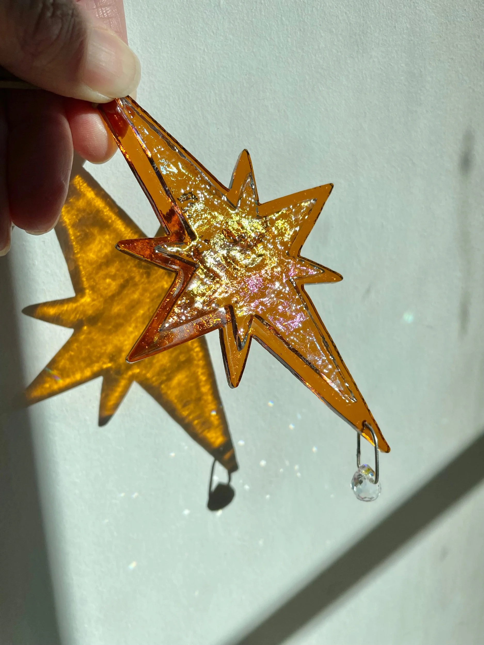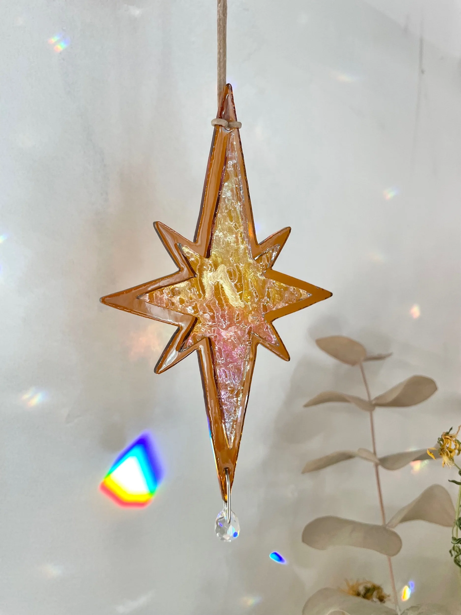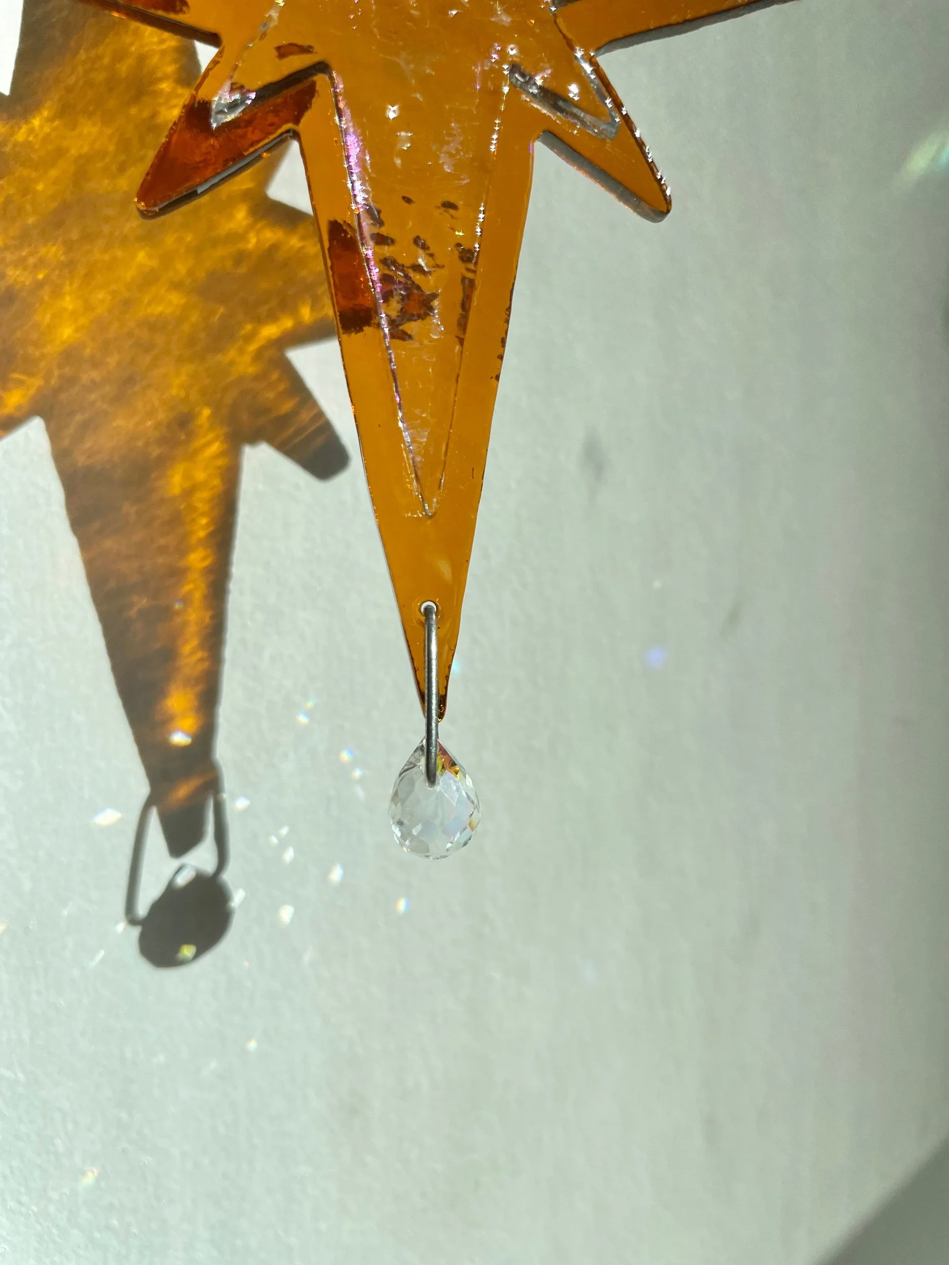 Sparkly mid century inspired starburst ornament. Fused using vibrant Oceanside glass with a textured iridescent glass, full of rainbow magic. A small AB coated crystal hangs from the bottom for extra sparkle.