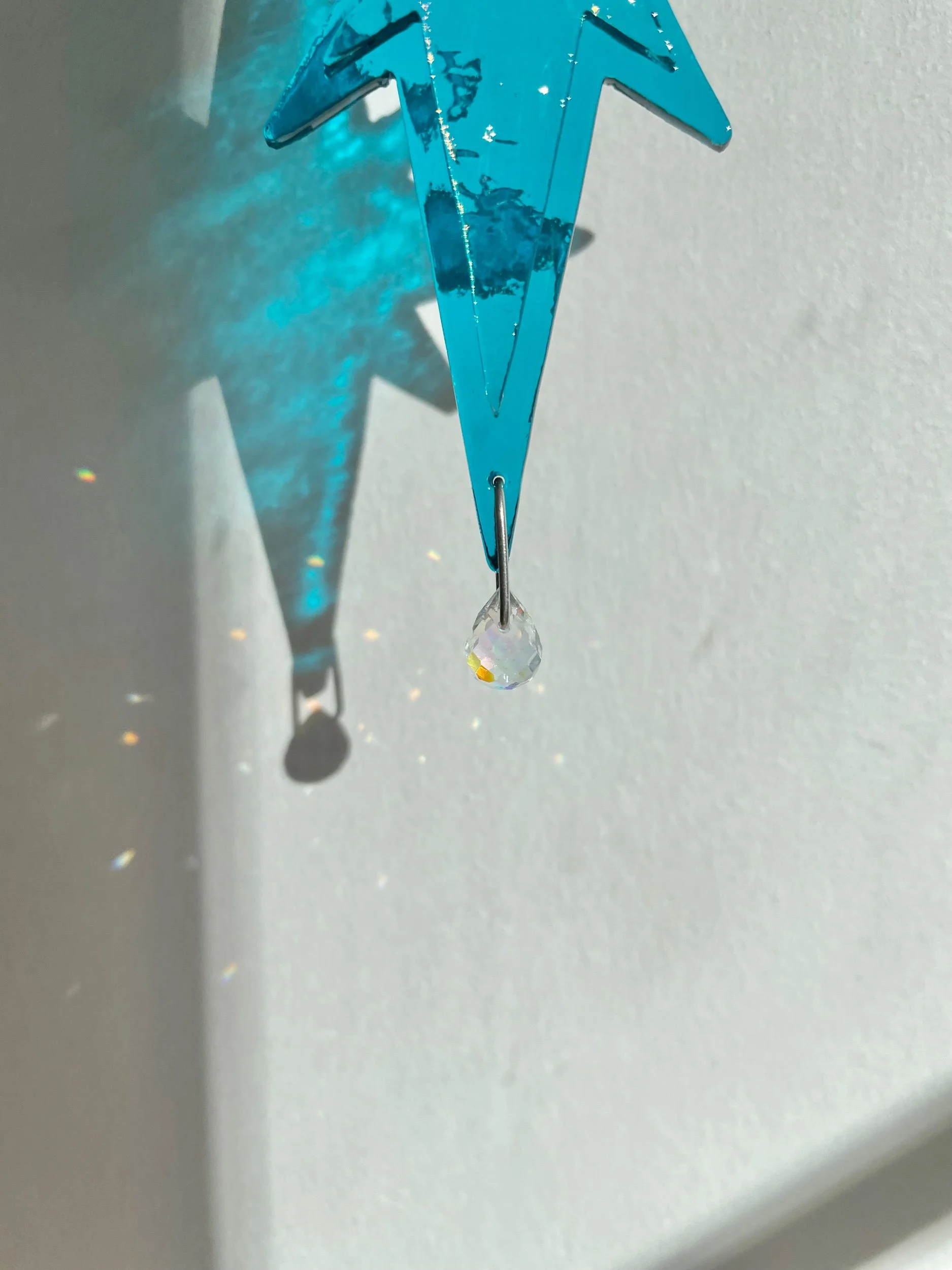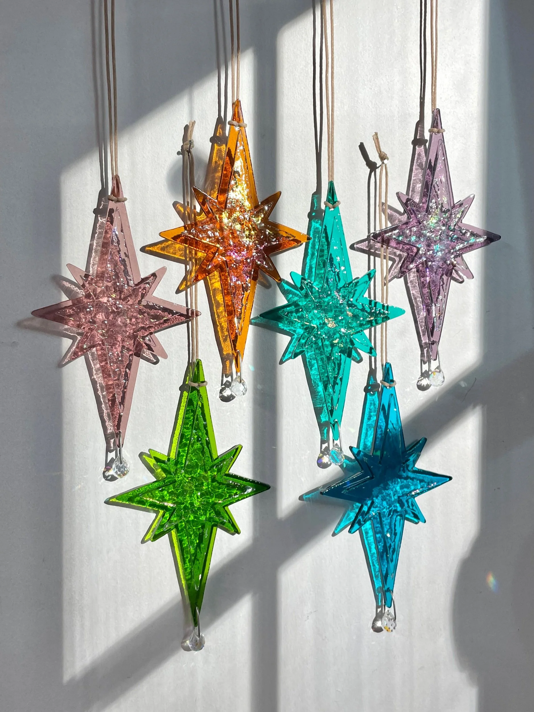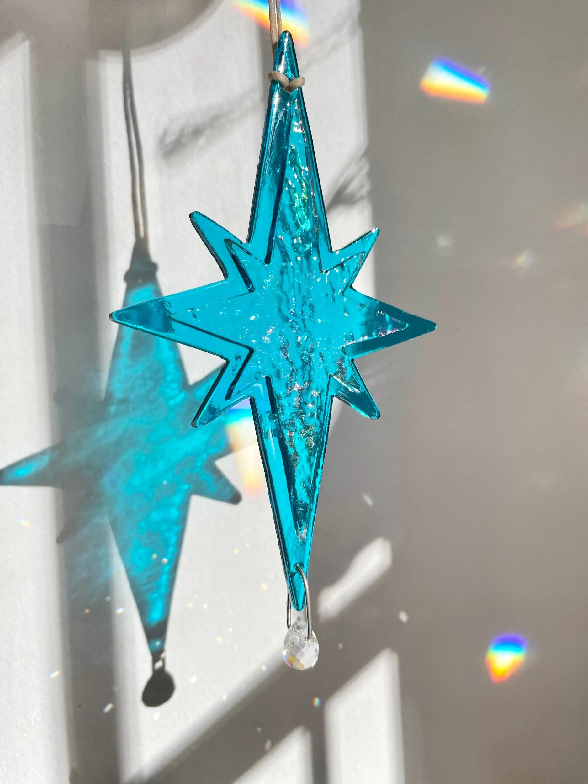 Sparkly mid century inspired starburst ornament. Fused using vibrant Oceanside glass with a textured iridescent glass, full of rainbow magic. A small AB coated crystal hangs from the bottom for extra sparkle.