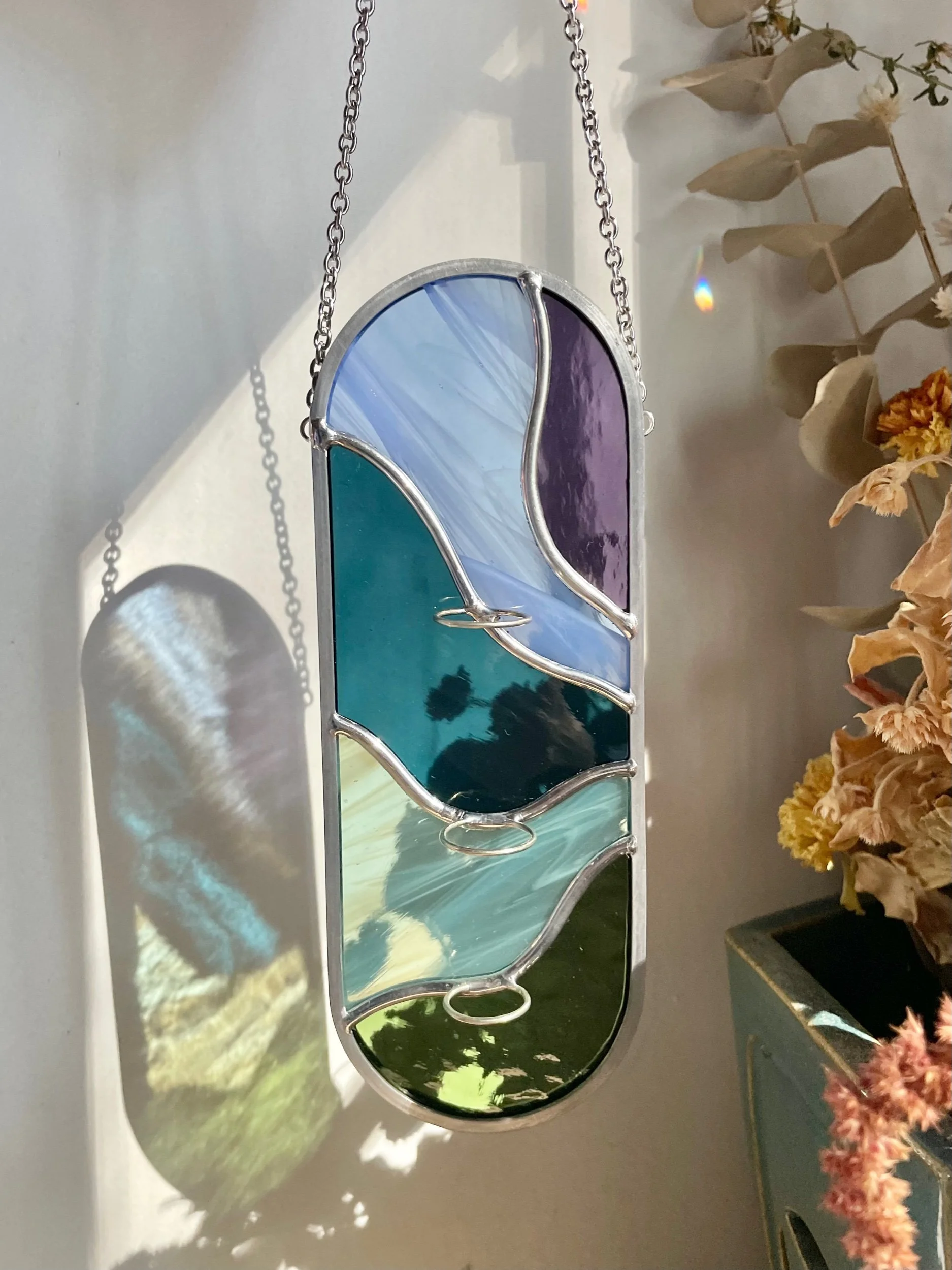 Made with purple, periwinkle, steel blue, sea foam green, and olive green glass.