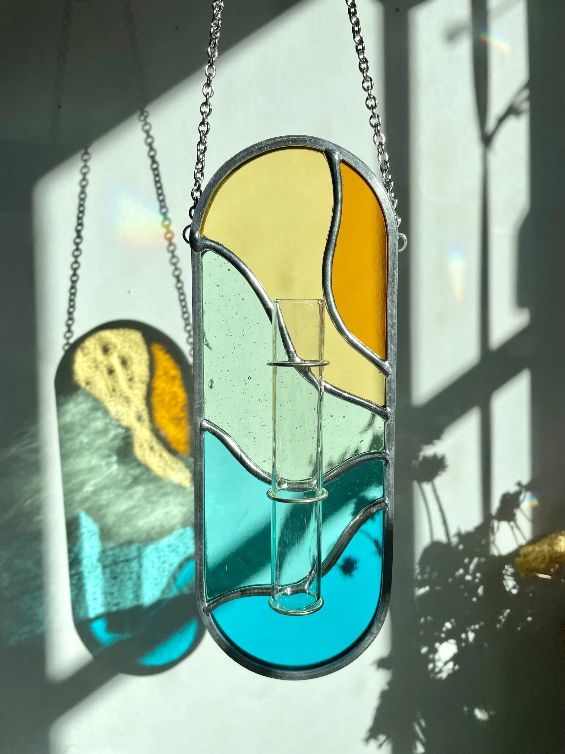 Made with amber, pale green, sky blue, and peacock blue glass.