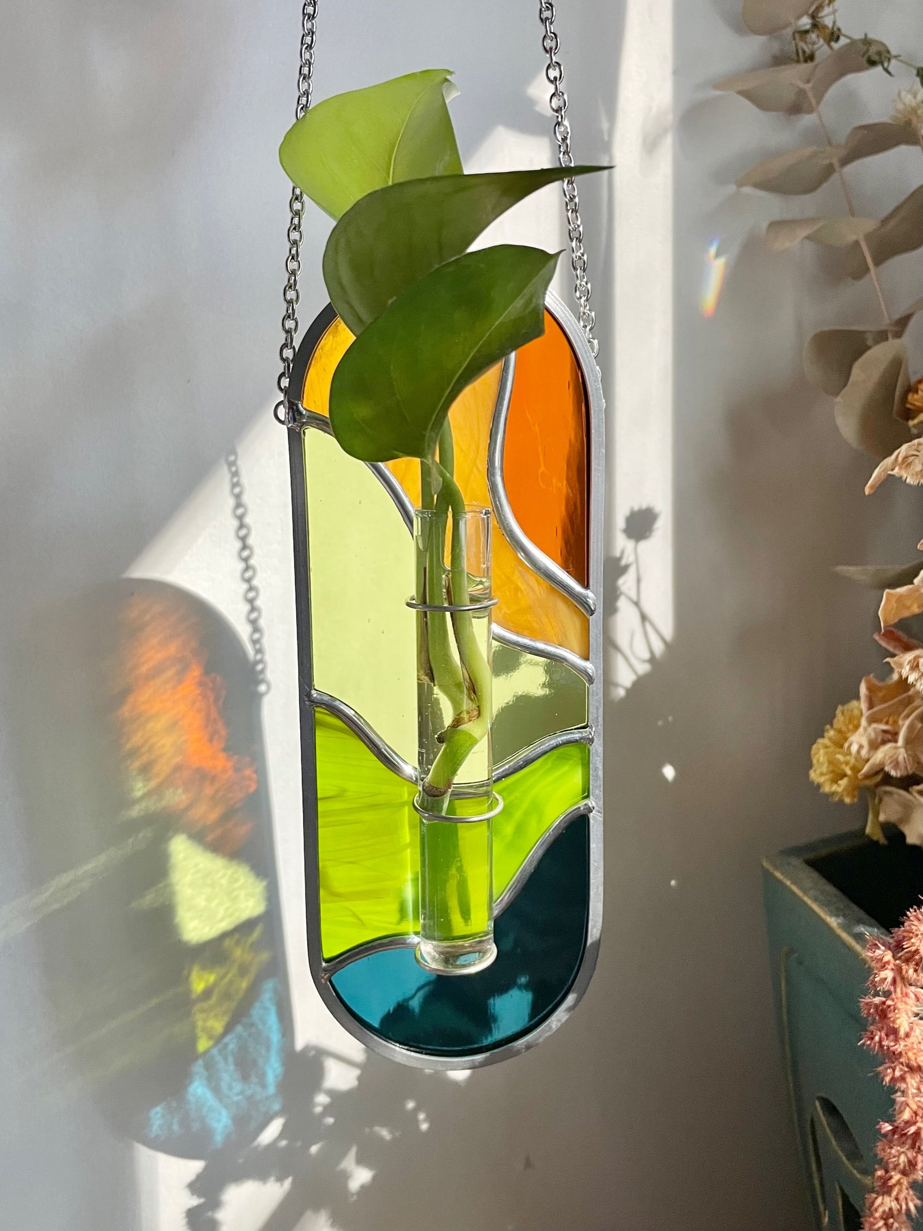Comes with a 4 “ glass tube for propagating, fresh cut or dried flowers. Tube is removable for easy cleaning/watering.