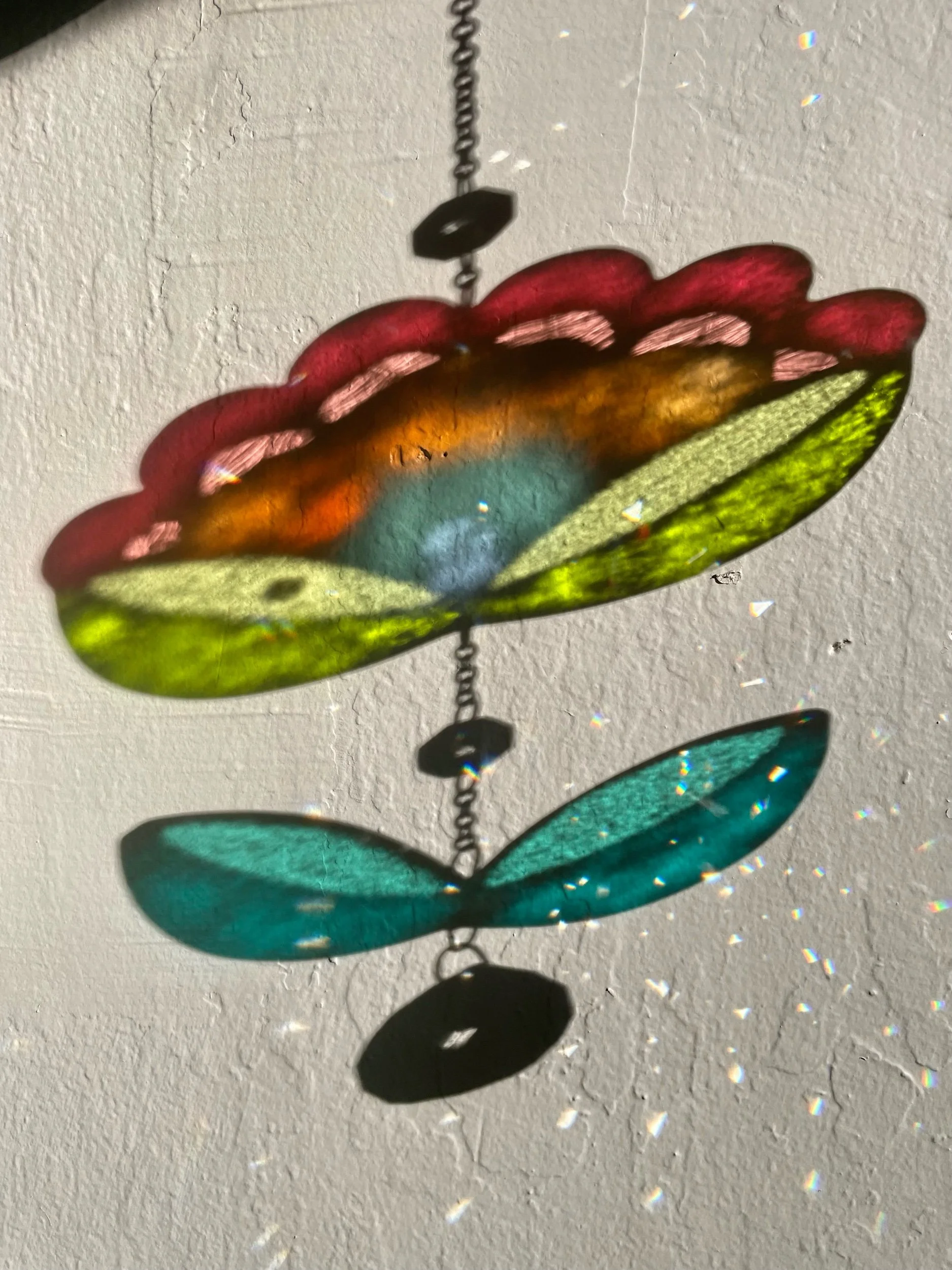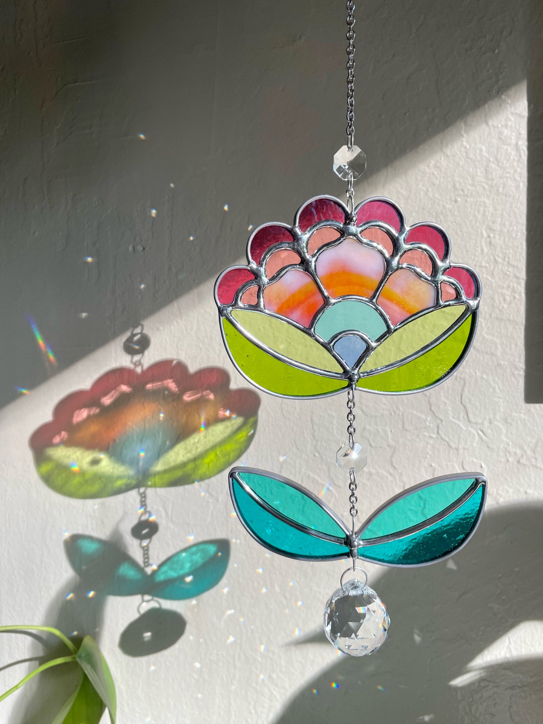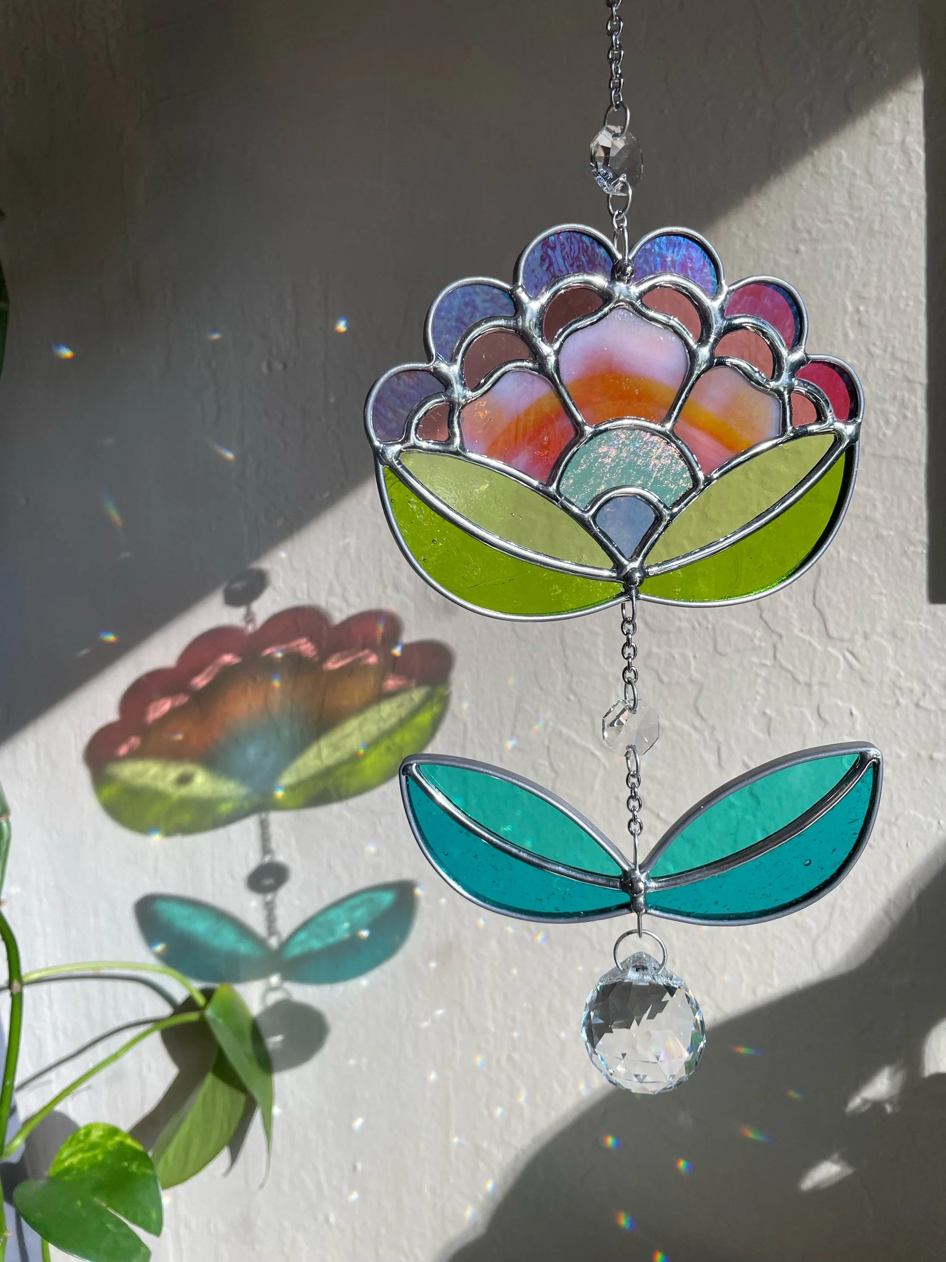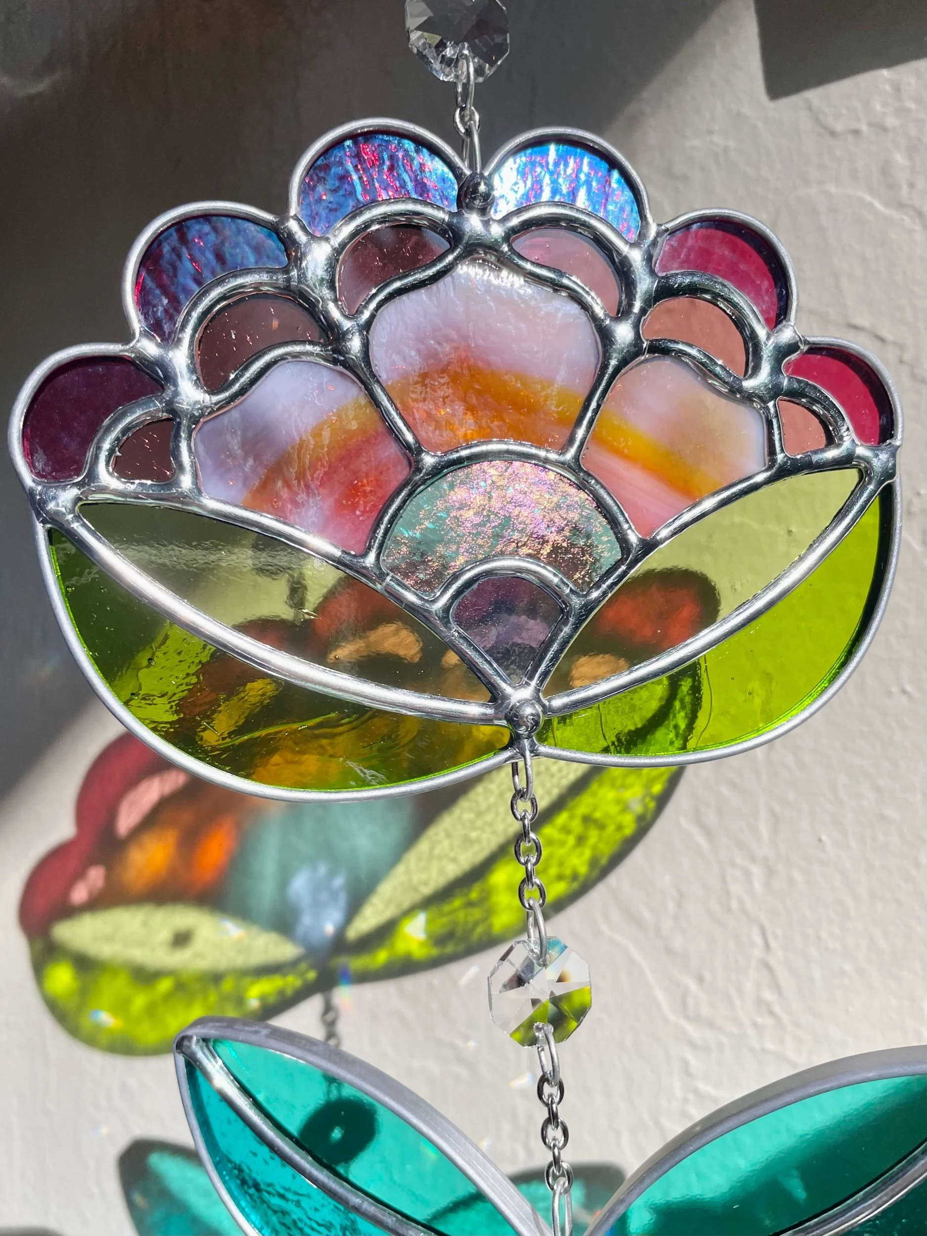 A sweet little vintage inspired floral to bring in the Spring vibes. All the Good Glass™️ was used to bring this beauty to life. Iridescent cranberry pink, vibrant pink, wispy pink/orange, iridescent aqua, and iridescent periwinkle were paired with bright lime green and turquoise leaves. When sun hits the large crystal hanging from the bottom, rainbows dance around the room.