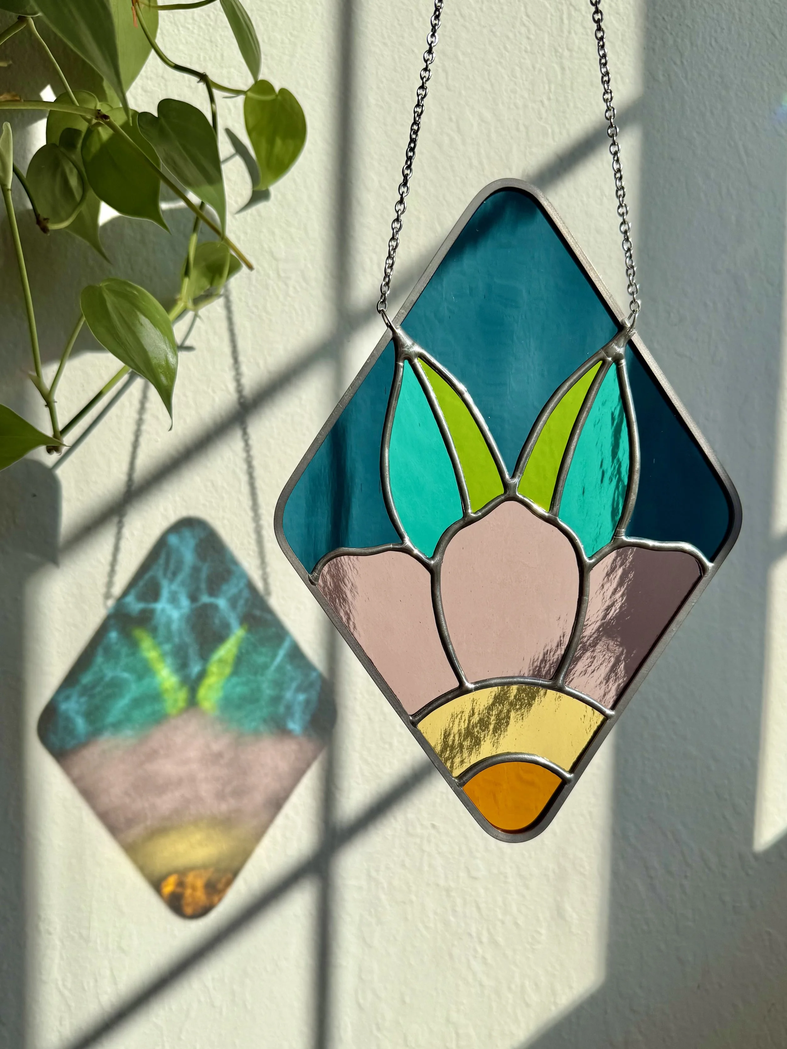 Made of mauve, amber, steel blue, turquoise, and moss green glass.