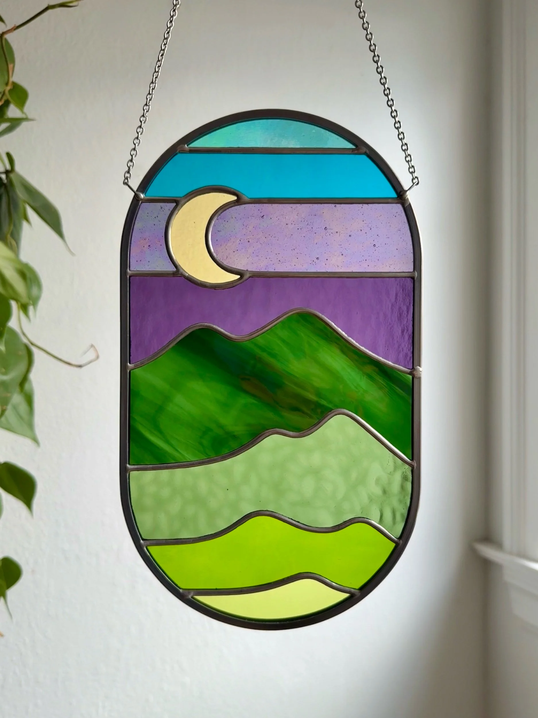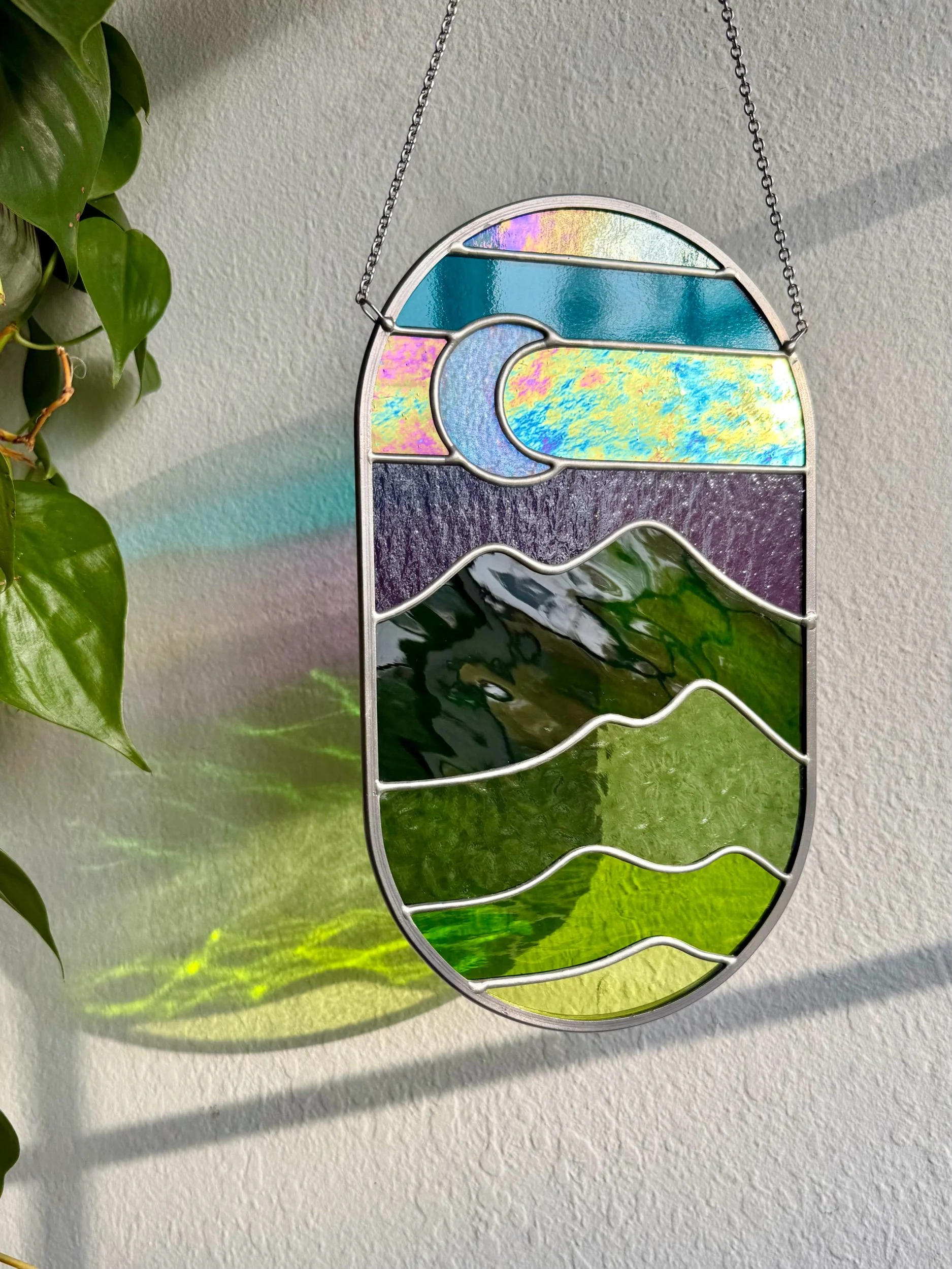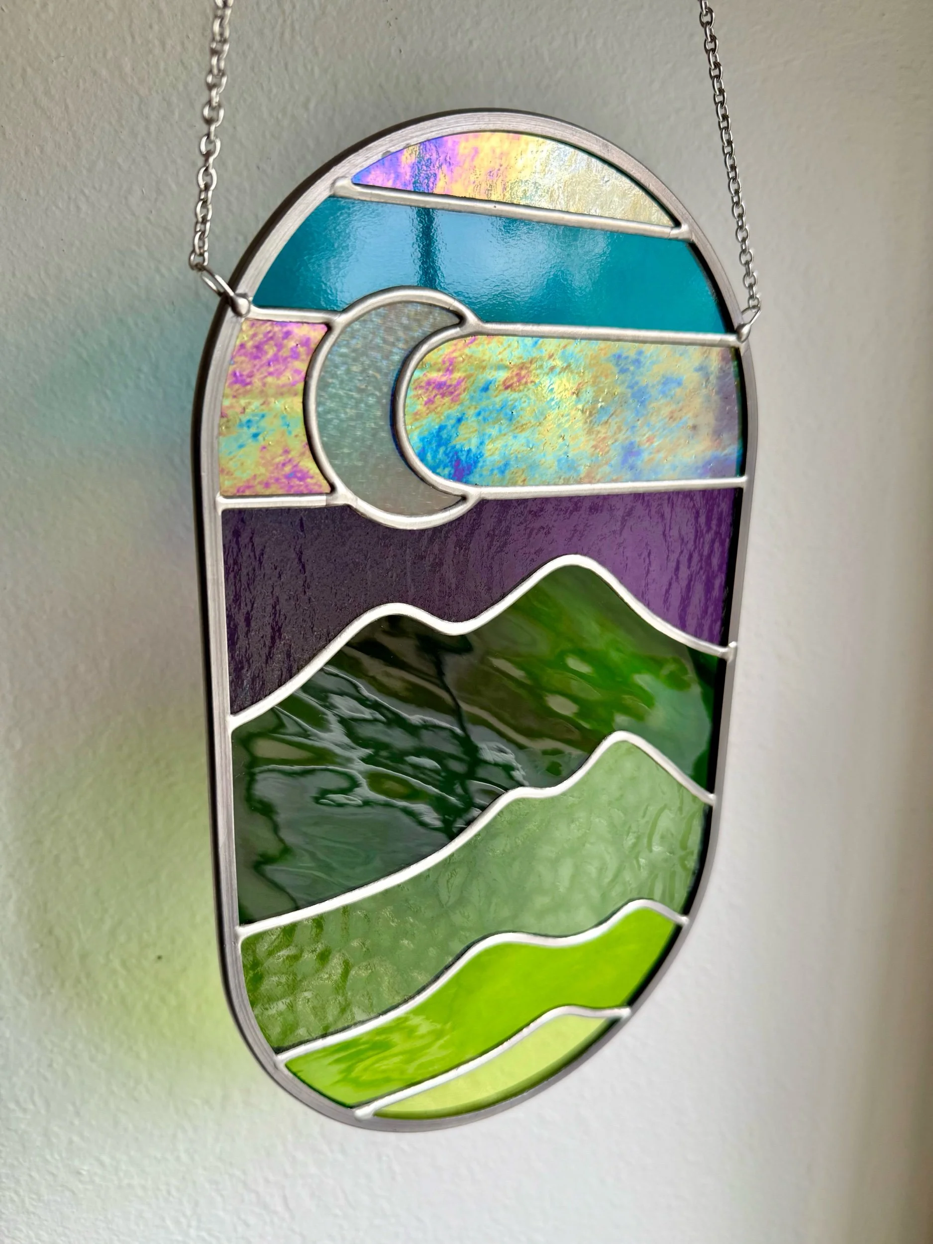 Inspired by the nearby Sierra Nevada mountains, but intended to remind you of the grooviest moonrise over your favorite canyons and peaks anywhere in the world. Made in vibrant cool-toned gradients with a shimmering iridescent moon.