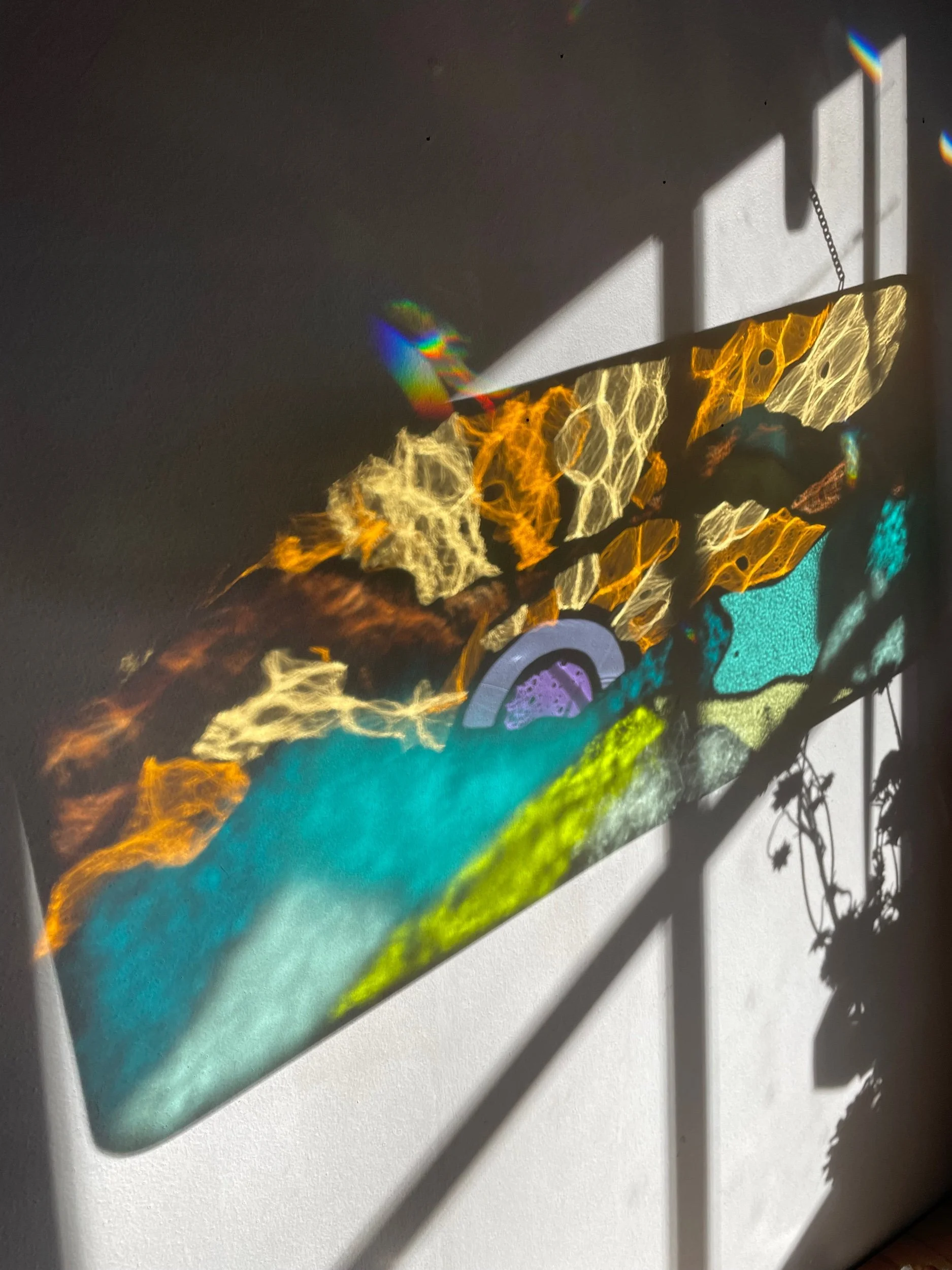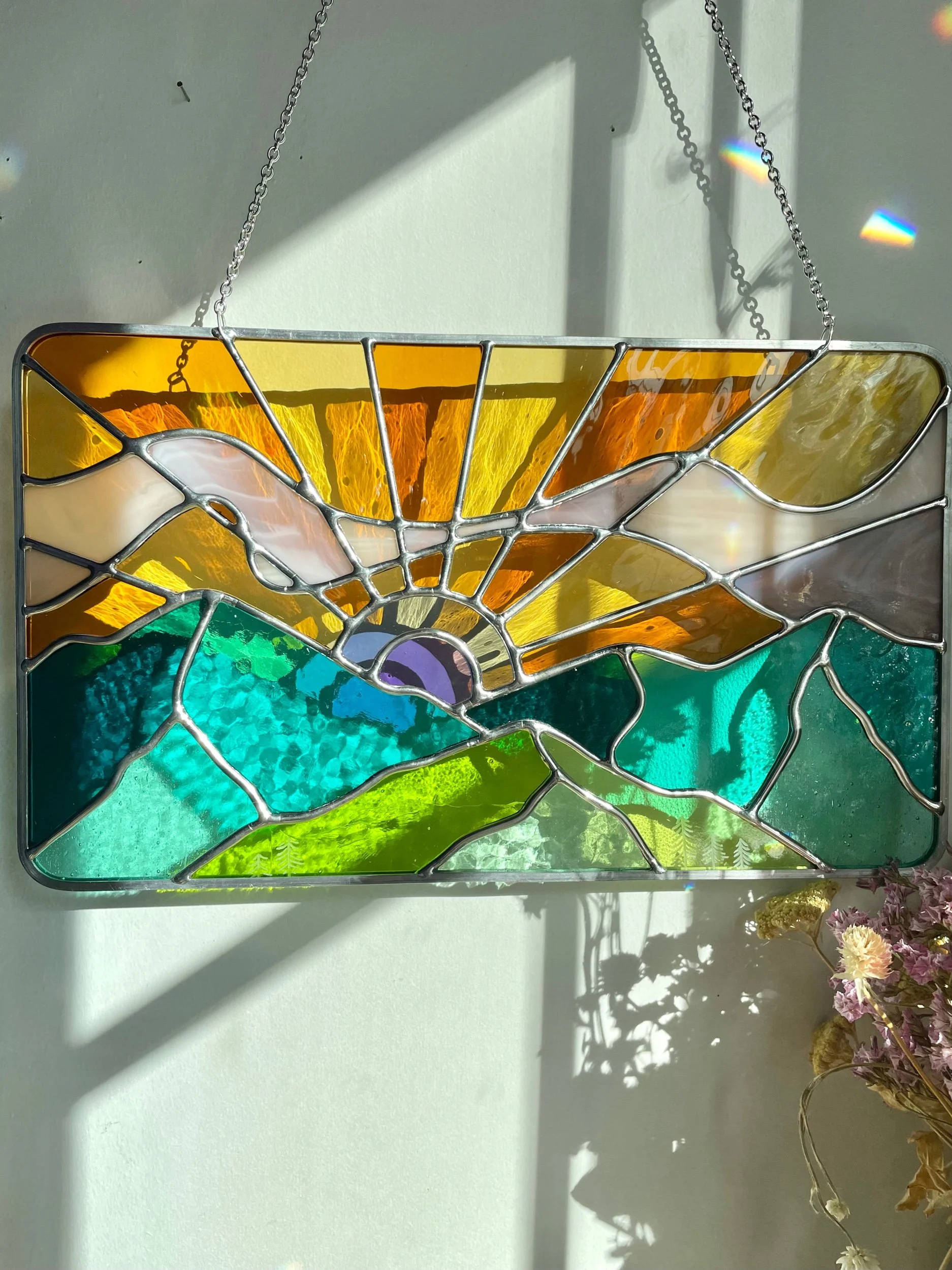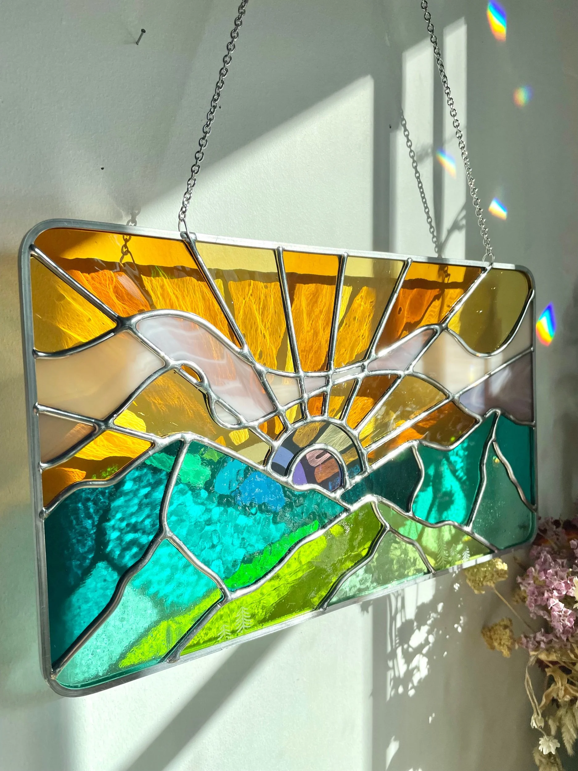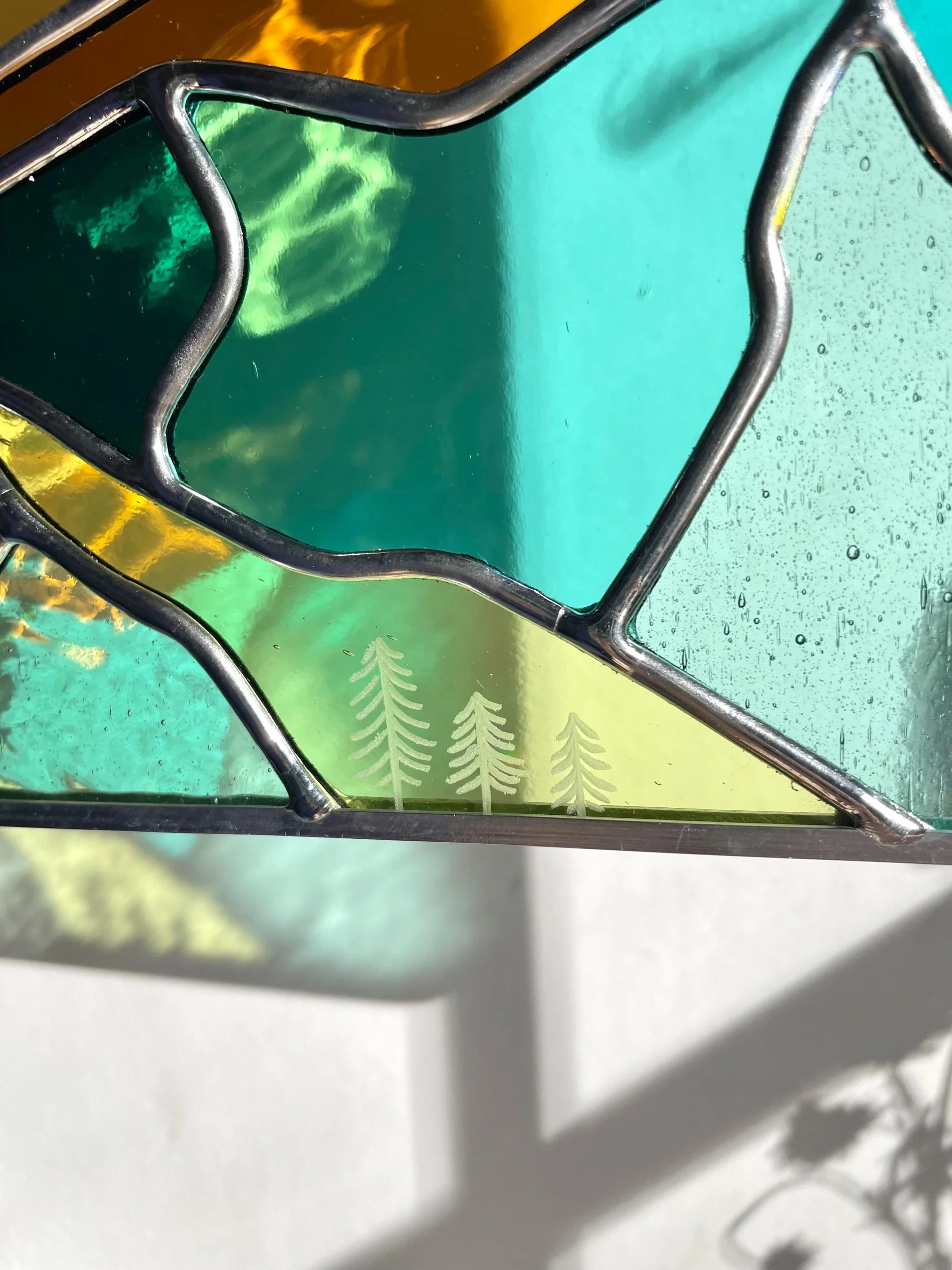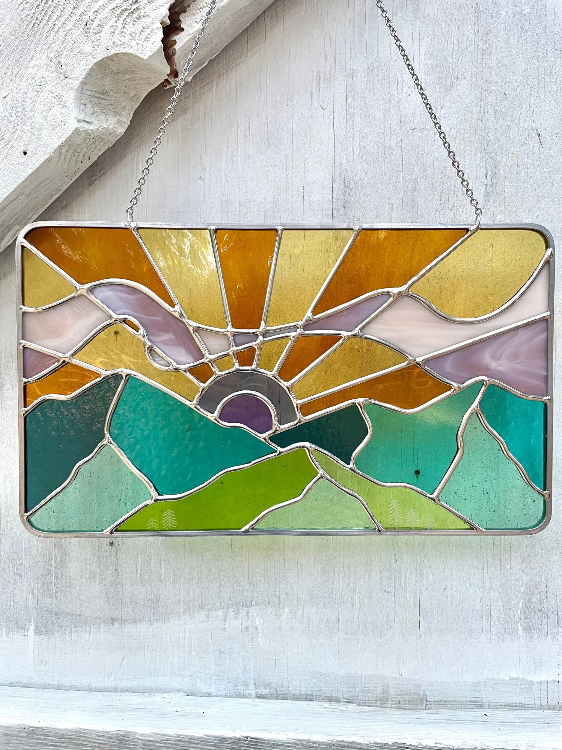 Mountains are made of various shades and textures of turquoise and green glass. Sun is made with stunning Fremont mouth blown glass in unique shade of purple. Wispy cloud is streaky champagne and light purple. Sun rays are amber water glass with an incredible refraction.