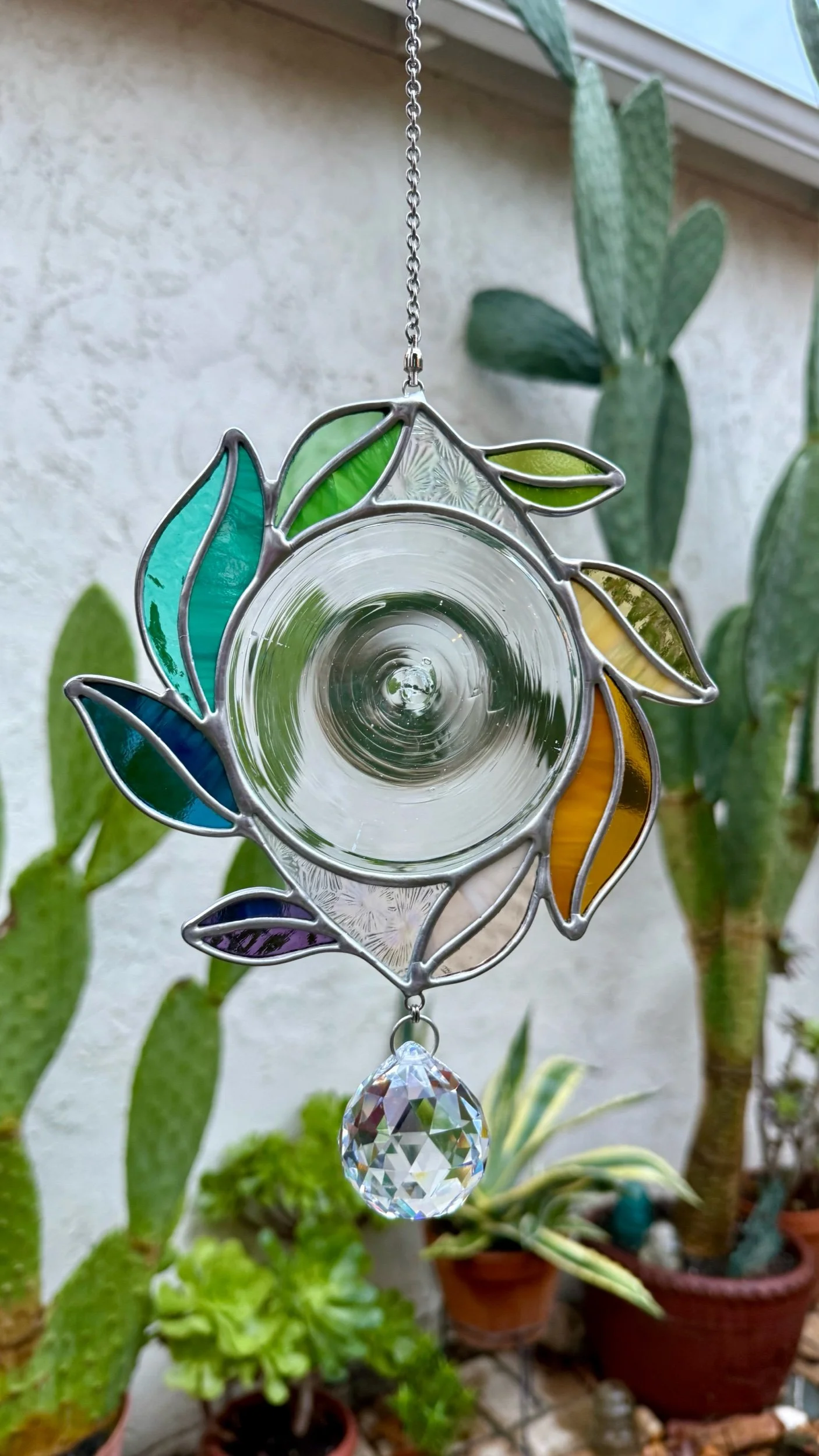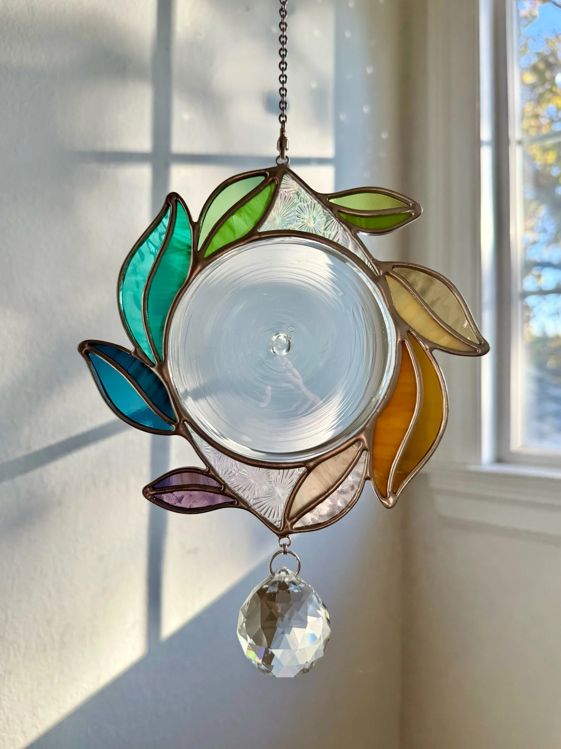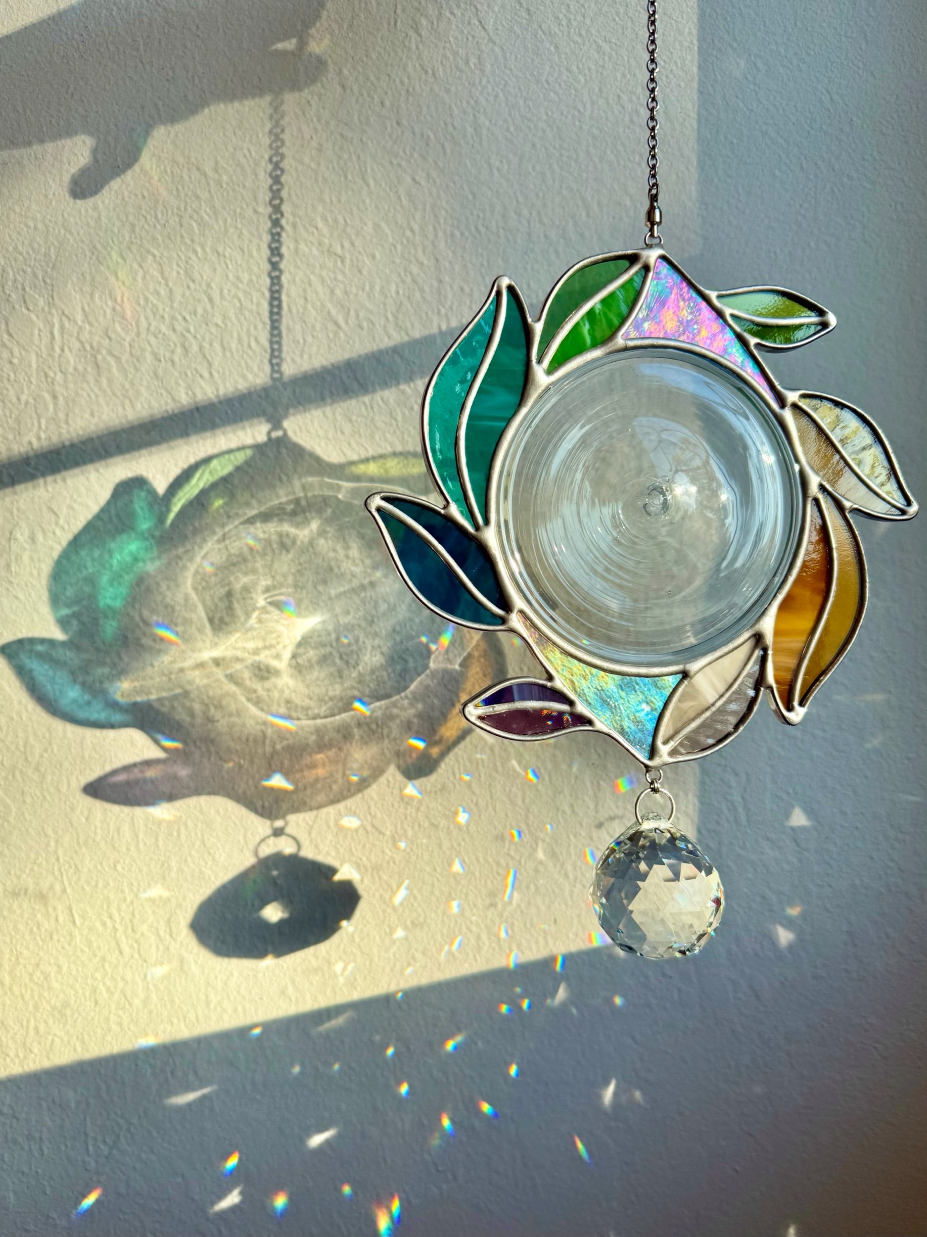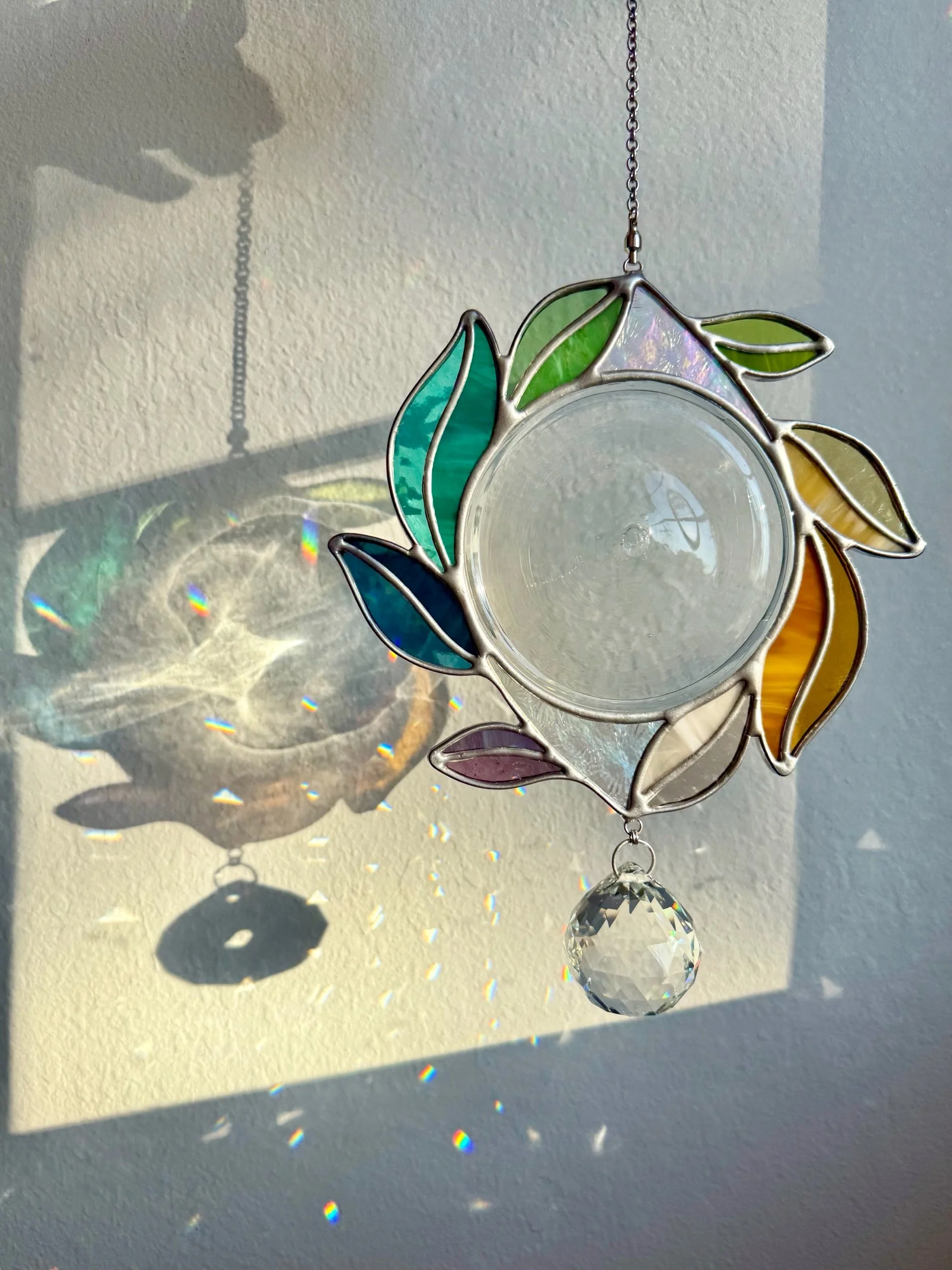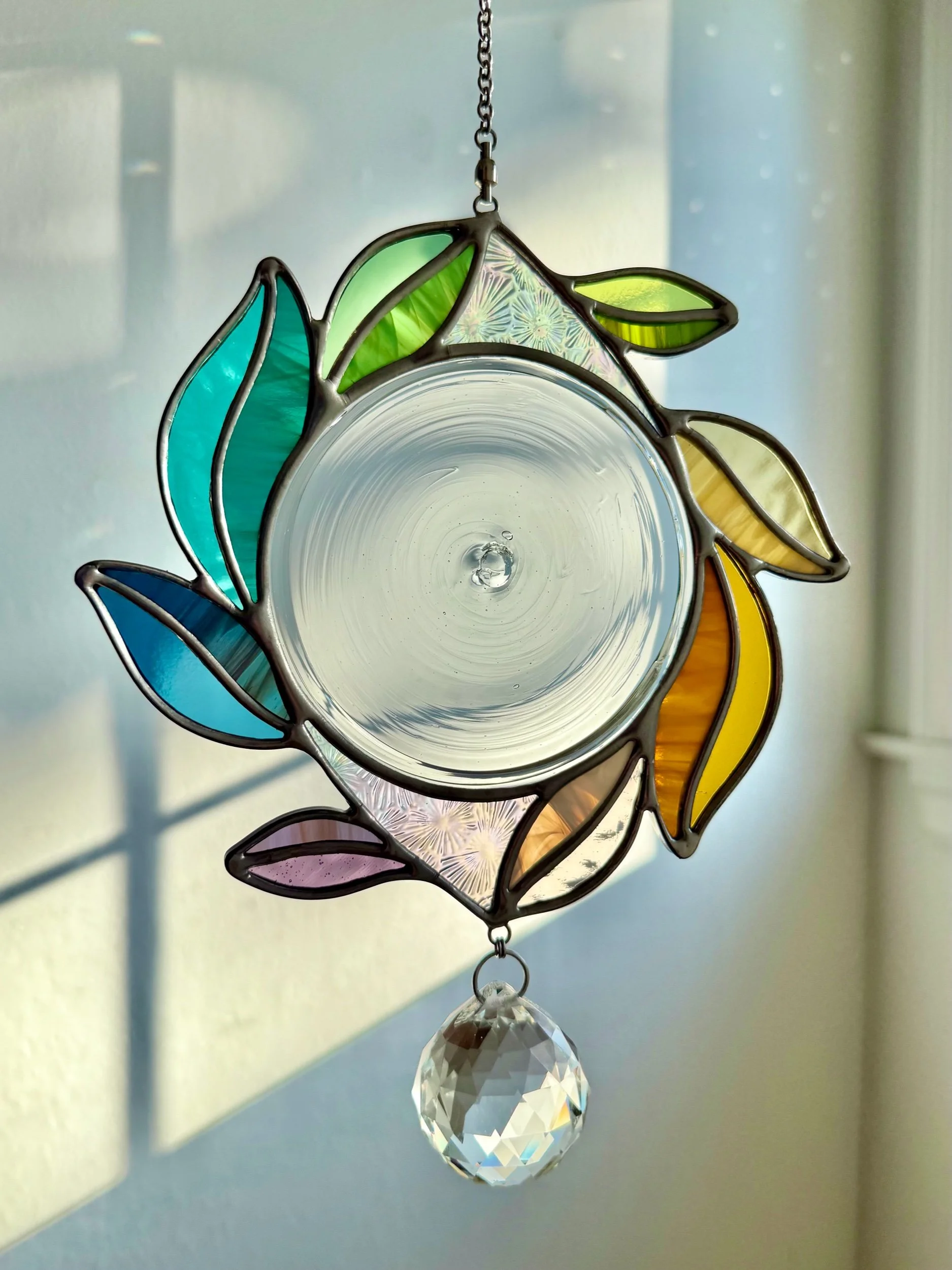 This soft rainbow vine swirls around a delicate vintage (approx. 1970’s) German-made glass rondel, mounted with spinning hardware so she dances in the light and a gentle breeze. The rondel casts a vibrant portal of light that makes this piece’s refraction its own work of art.