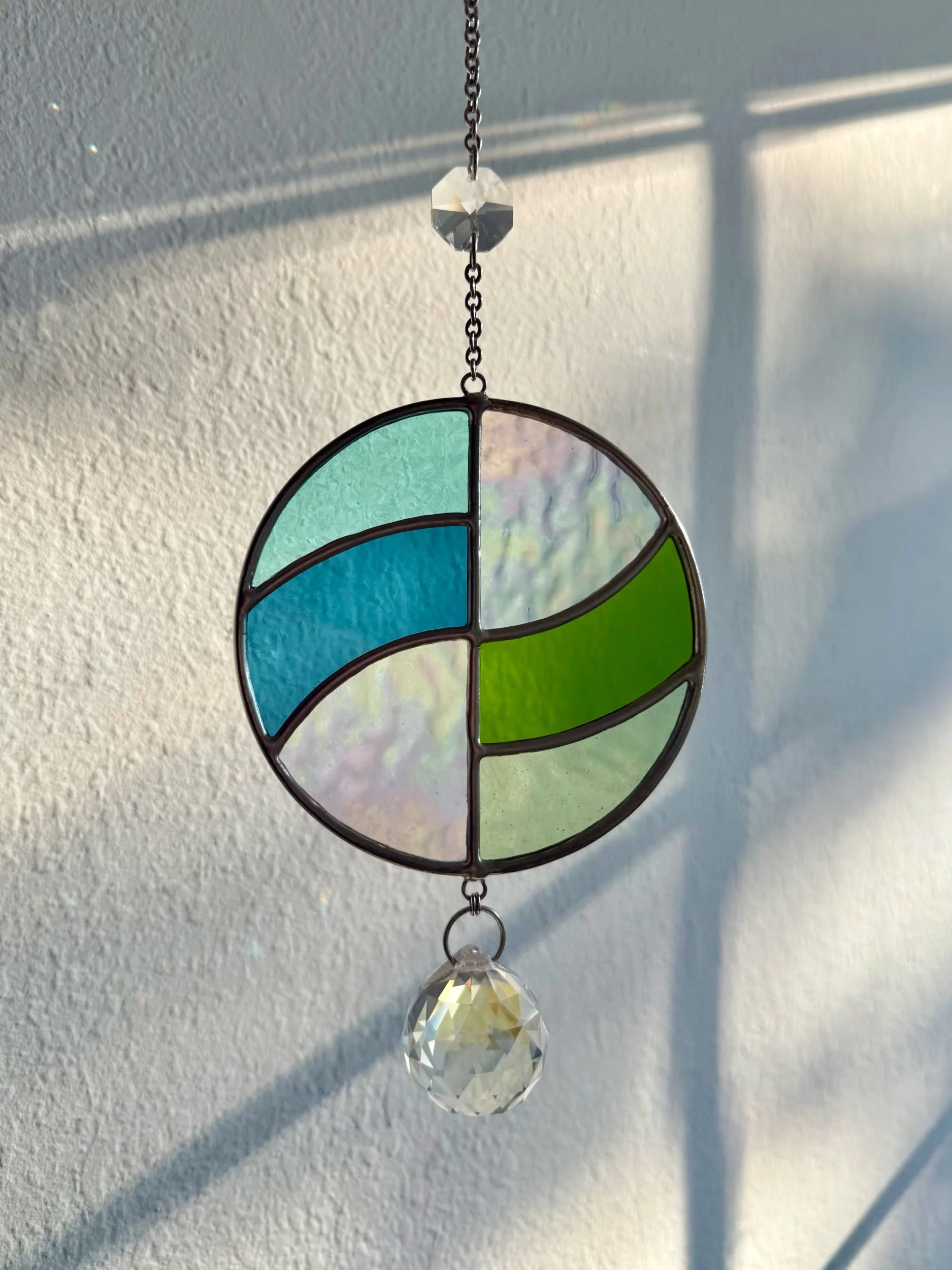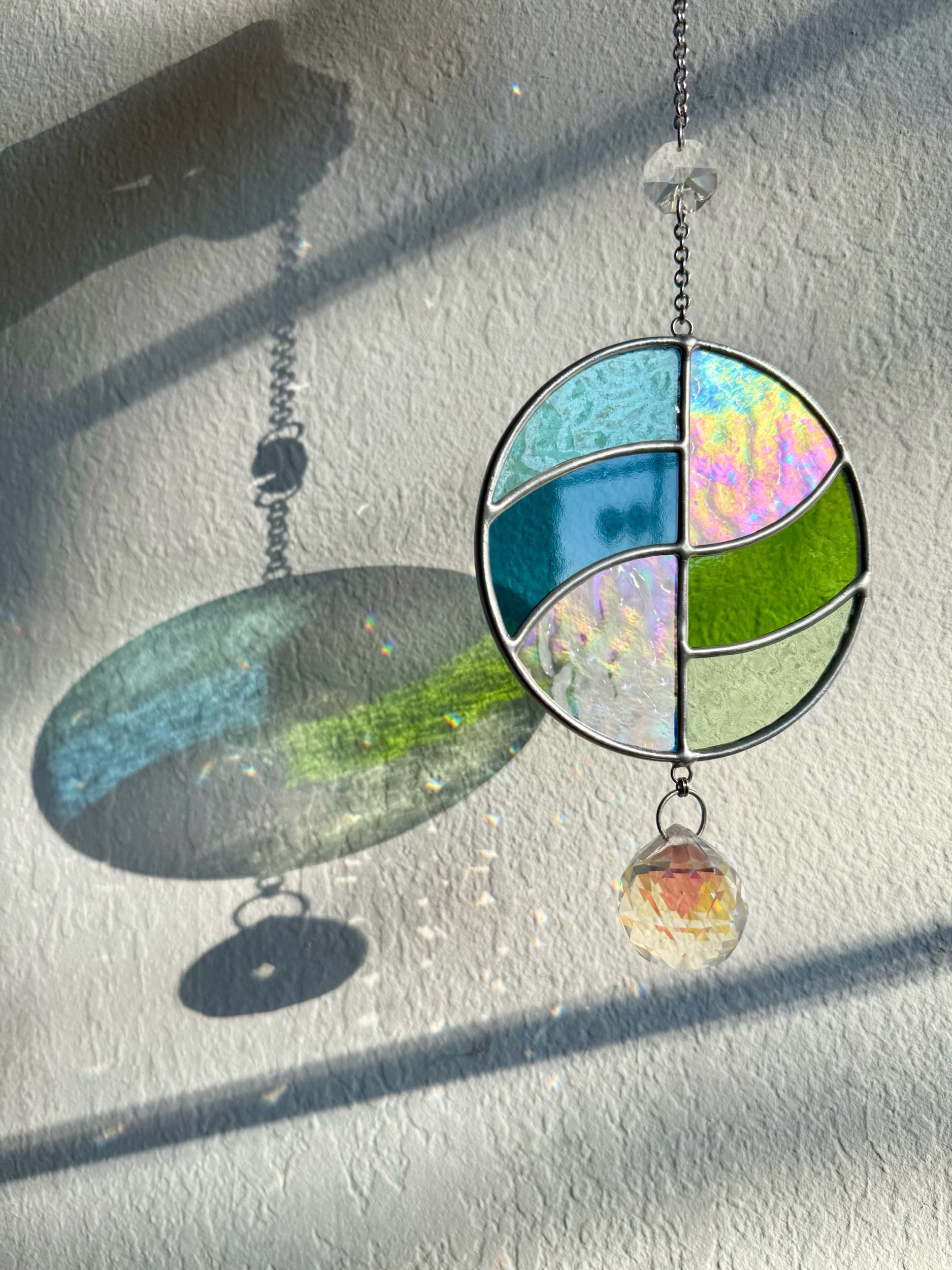This happy little design packs a sweet punch of color. Made with a combination of new and secondhand glass, including a 30mm crystal prism to cast rainbow sparkles across your space when hit by direct sunlight.