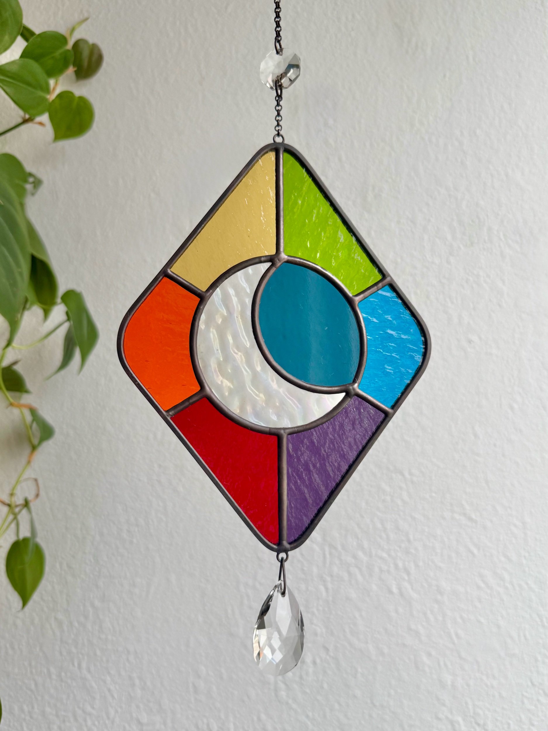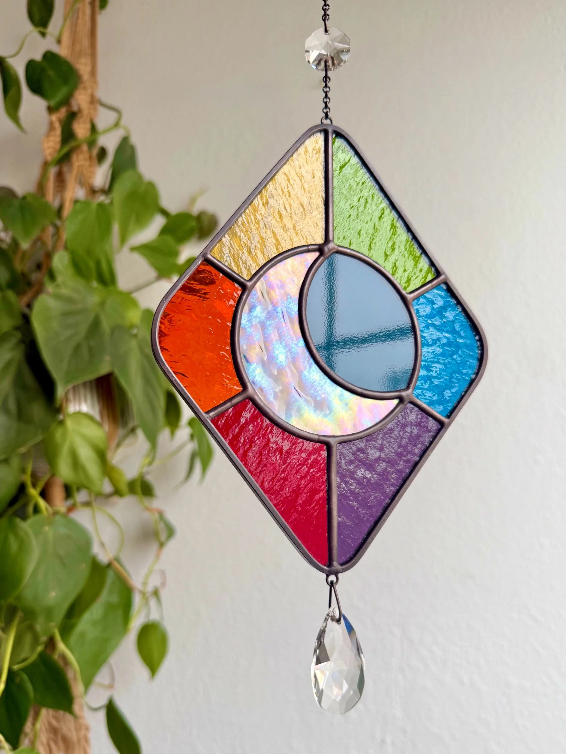 This dreamy little design packs a punch of color. Made with a vibrant rainbow glass and good vibes, including a 30mm teardrop crystal to cast rainbow sparkles across your space when hit by direct sunlight.