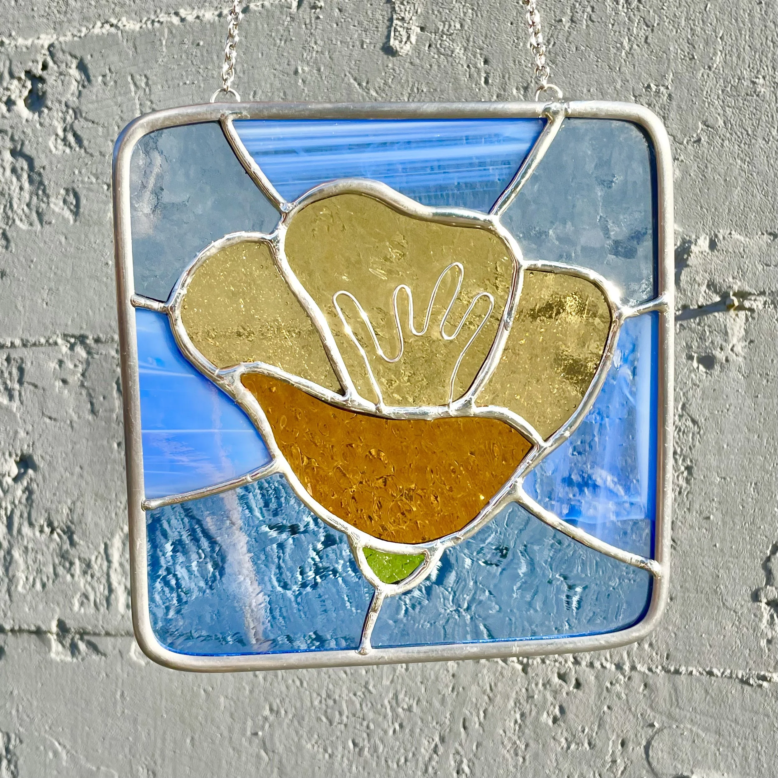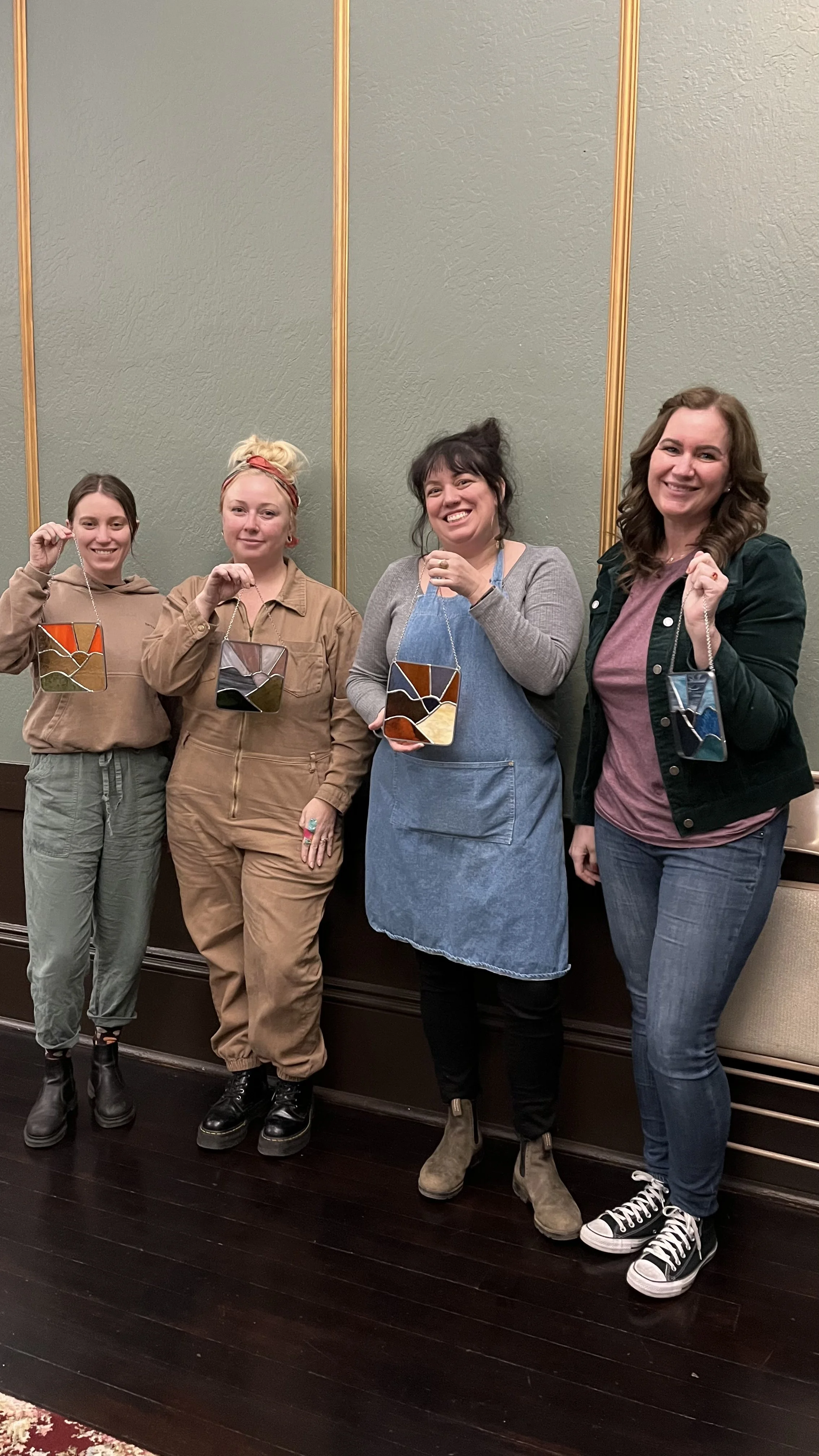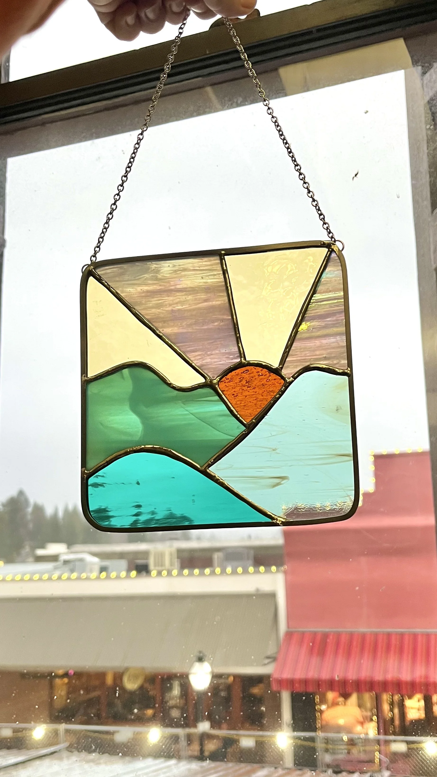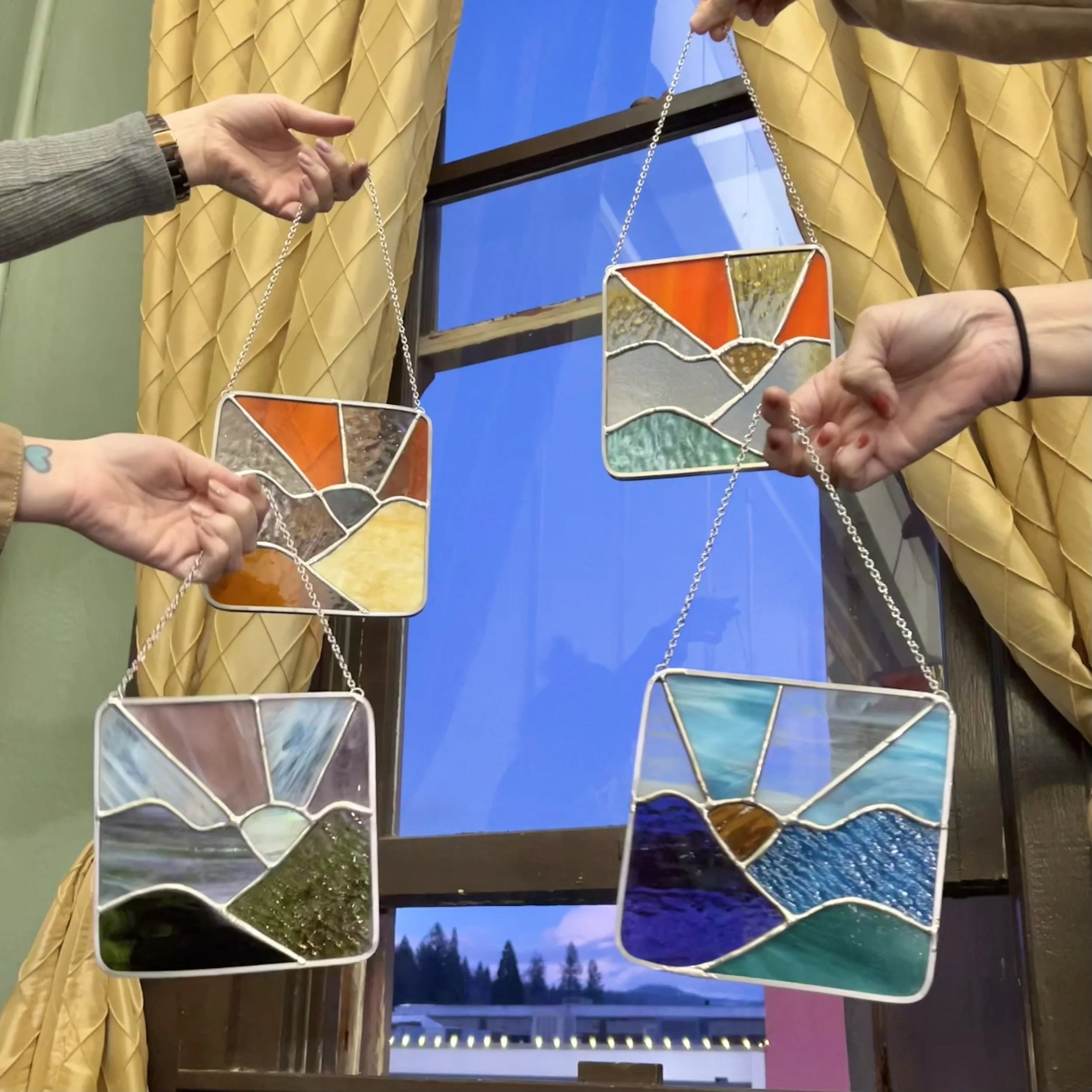 Our small workshops (3-6 students) are held in historic Downtown Grass Valley, California, nestled in the Sierra Nevada foothills where we grew up. Each workshop is only one session long and all students leave with a finished piece of stained glass artwork, made with their own two hands. Check out some of our former students’ beautiful work below: